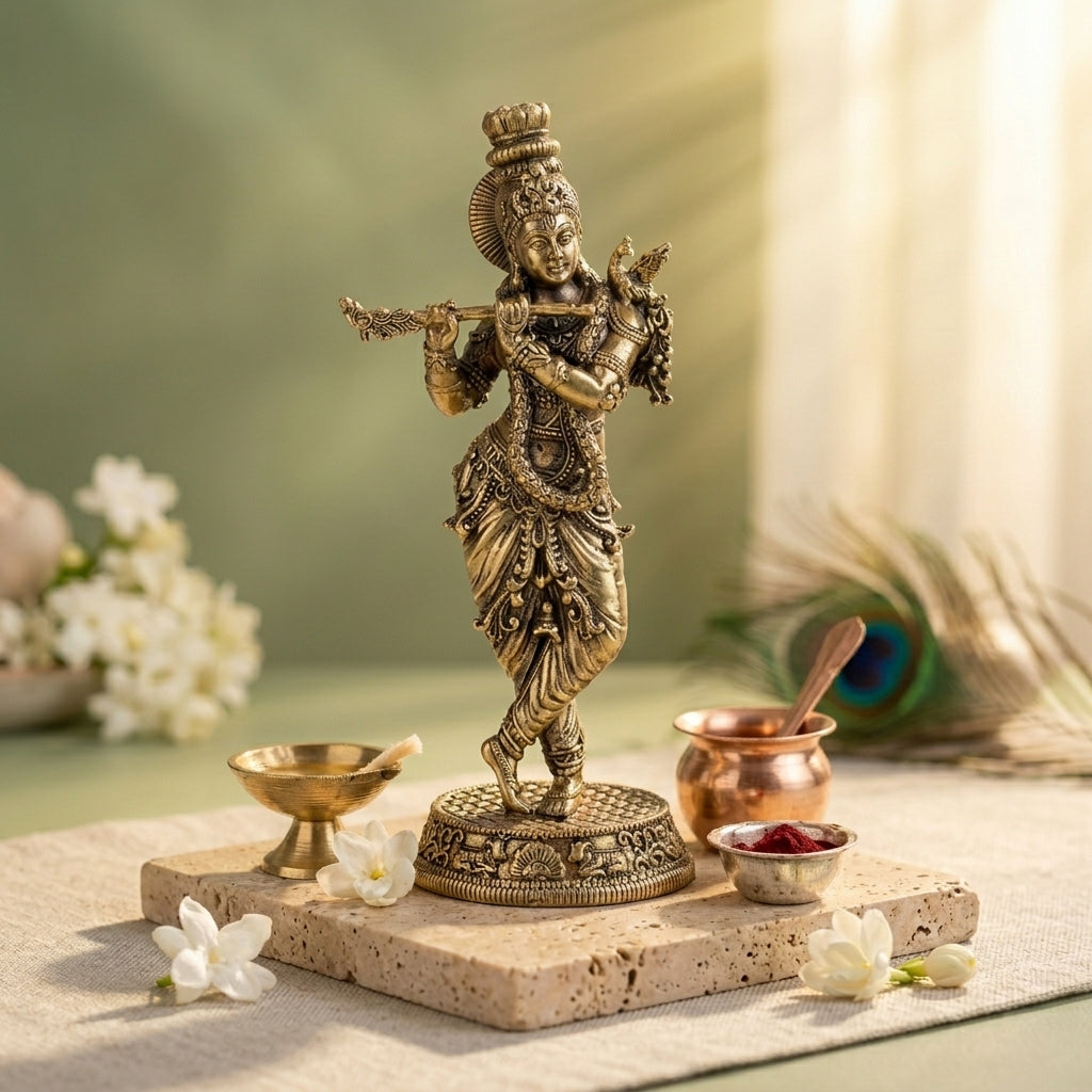 Antique Brass Standing Krishna Idol β Flute Kanha Murti for Love & Harmony
