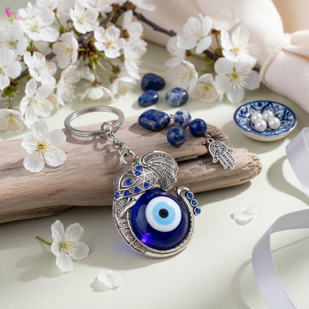 Elephant Evil Eye Keychain | Nazar Suraksha Keyring with Royal Elephant Charm for Luck & Protection-11 cm Hight