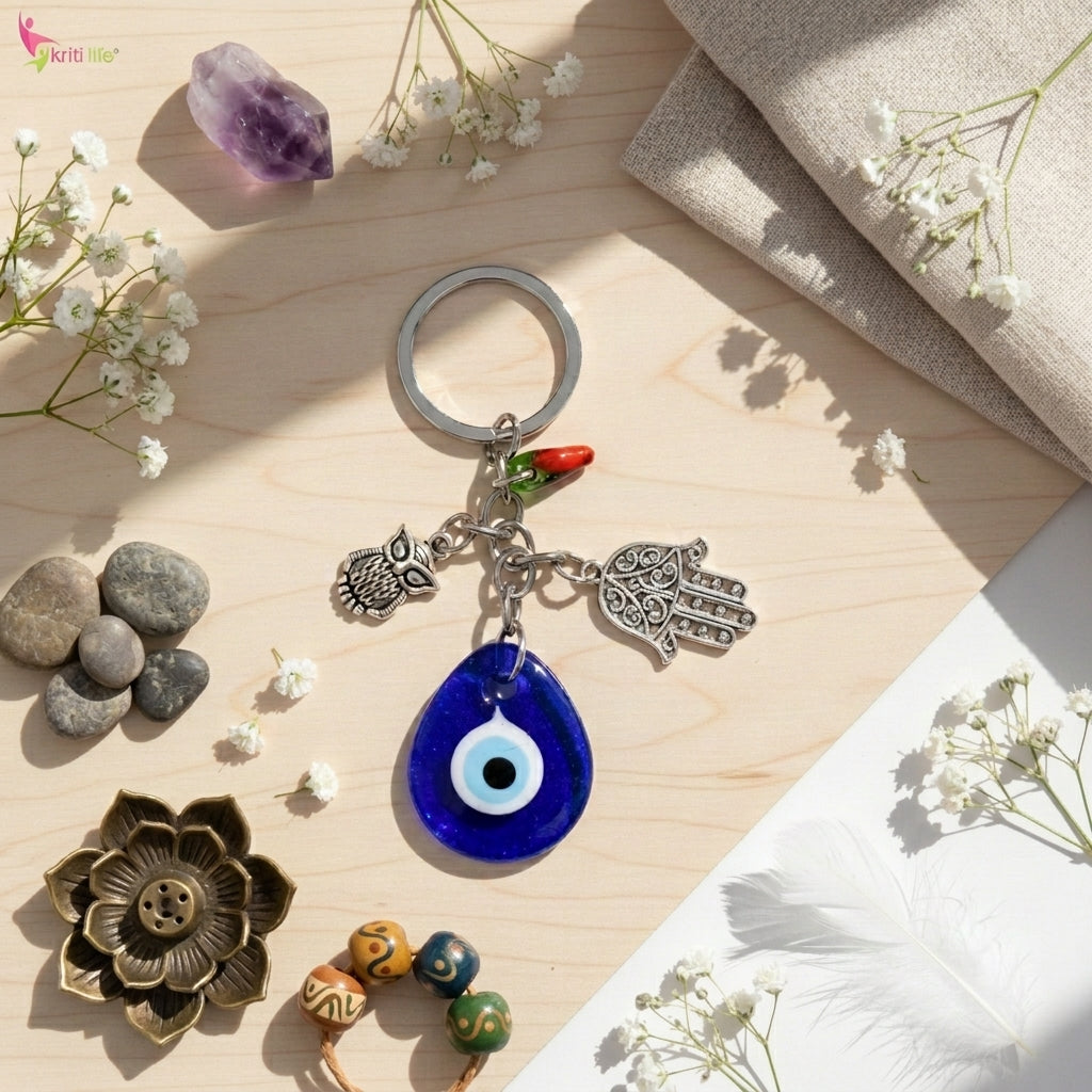 Evil Eye Keychain with Owl, Hamsa & Chilli Charm | Protection from Negativity & Stylish Accessory- 12 cm Hight