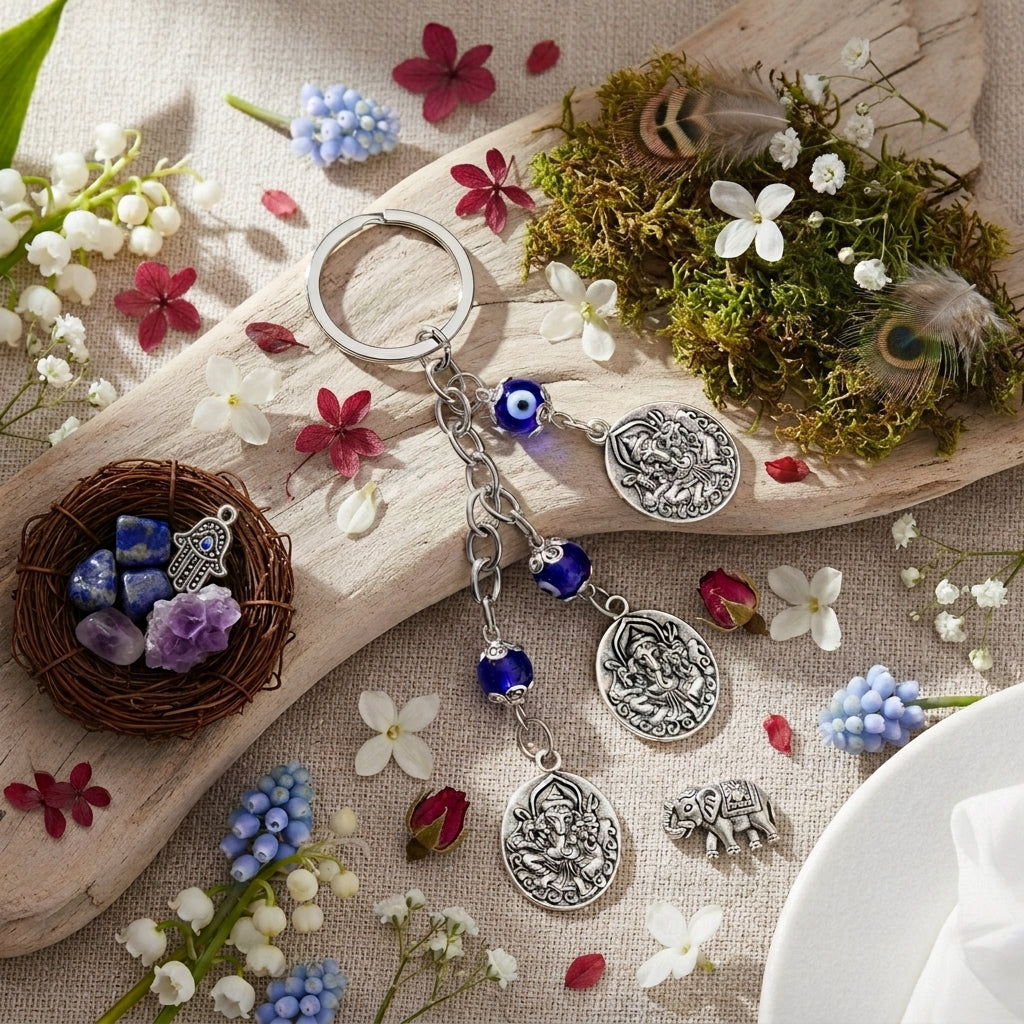 Ganesh Evil Eye Keychain | Nazar Suraksha with Ganpati Charms & Blue Protection Beads-13 cm Hight