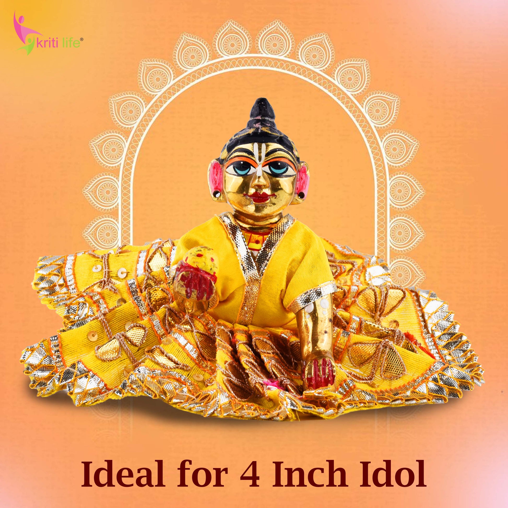 Dress your beloved Laddu Gopal in this beautifully handcrafted yellow outfit adorned with exquisite golden embroidery and fine detailing. Designed especially for 4-inch idols, this elegant dress (poshak) features intricate lacework, shimmering accents, and comfortable fabric that enhances the divine aura of your Kanha Ji. Whether it’s for Janmashtami, daily darshan, or festive rituals, this dress adds a spiritual charm and festive touch to your home temple. Made with love and devotion, it reflects vibrant Indian tradition and ensures your deity looks resplendent.