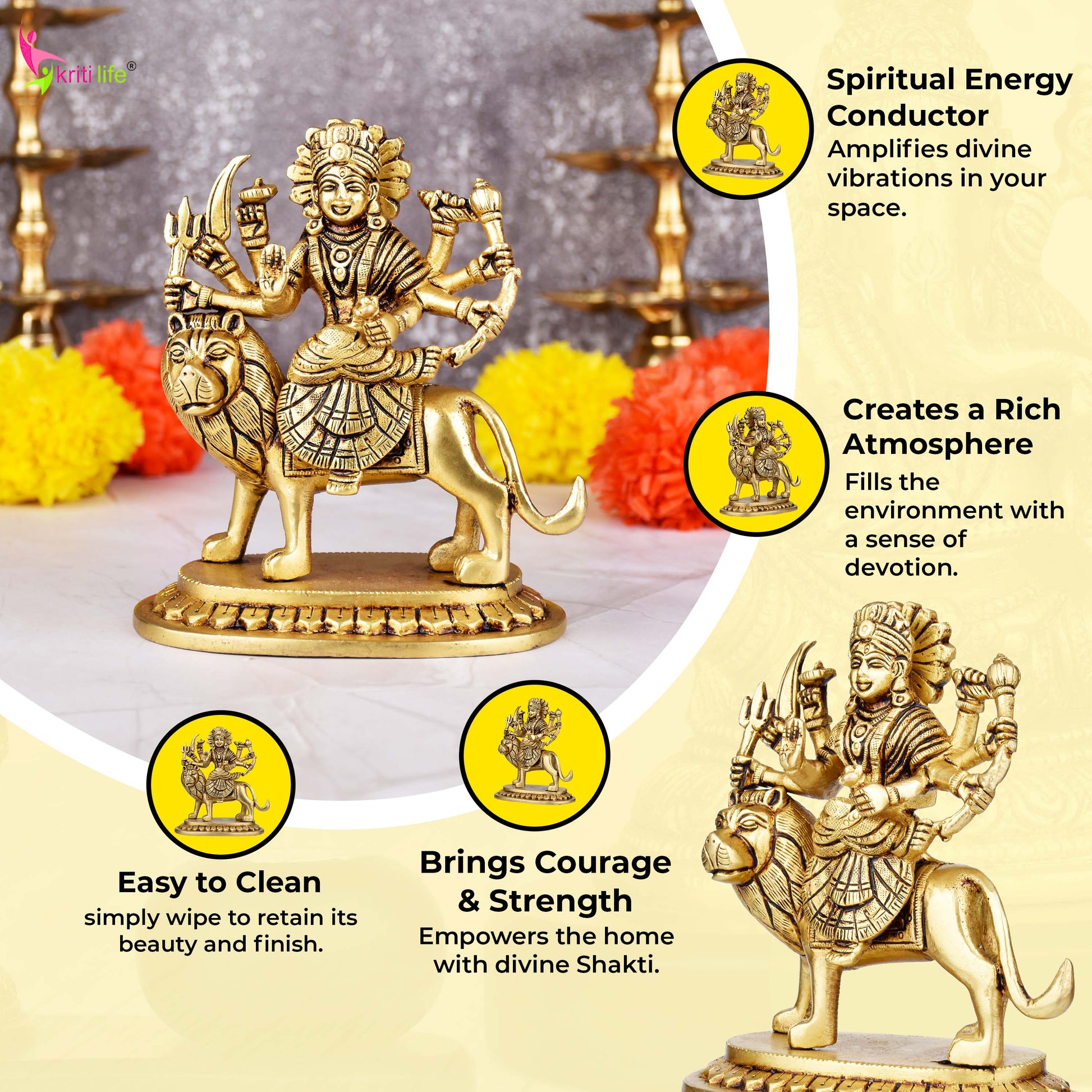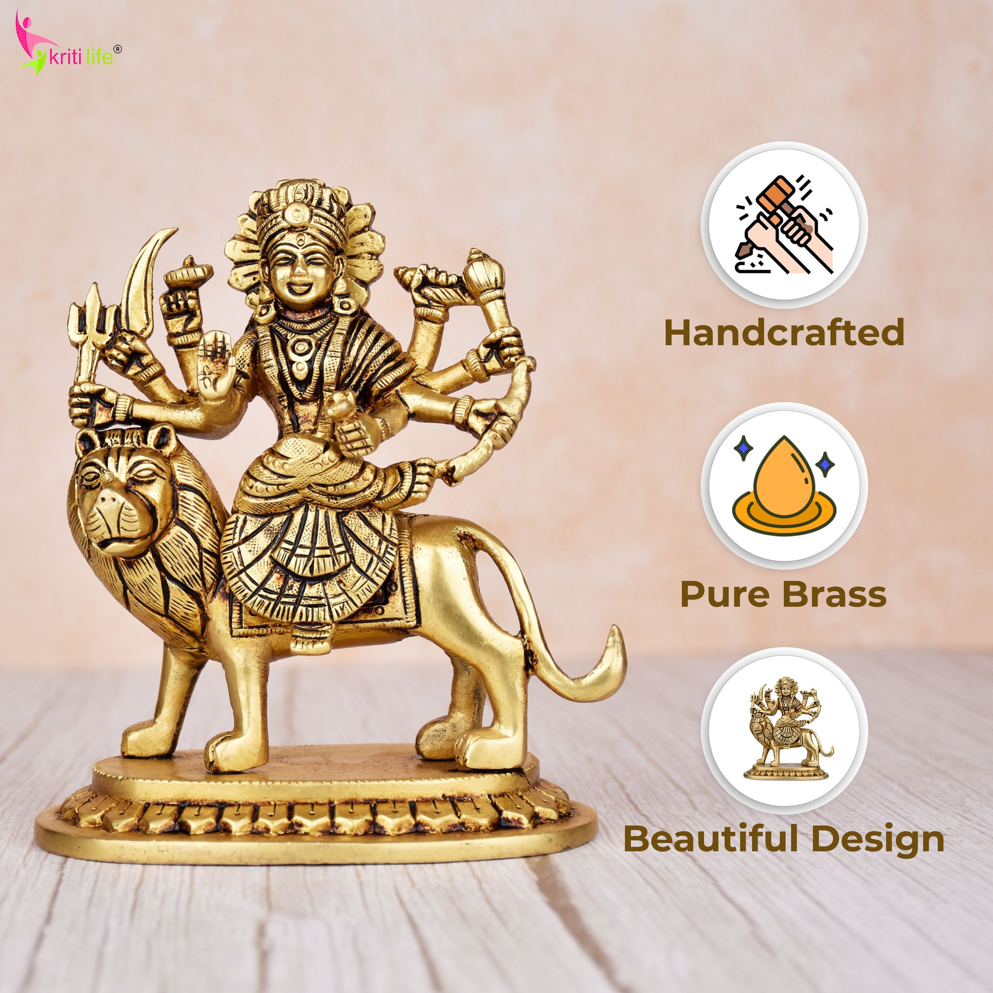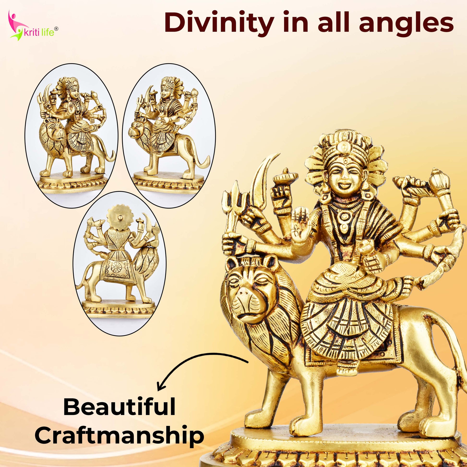 Brass Durga Maa Idol on Lion | 5.5 inches | 8-Handed Hindu Goddess Figurine for Navratri, Diwali & Gift