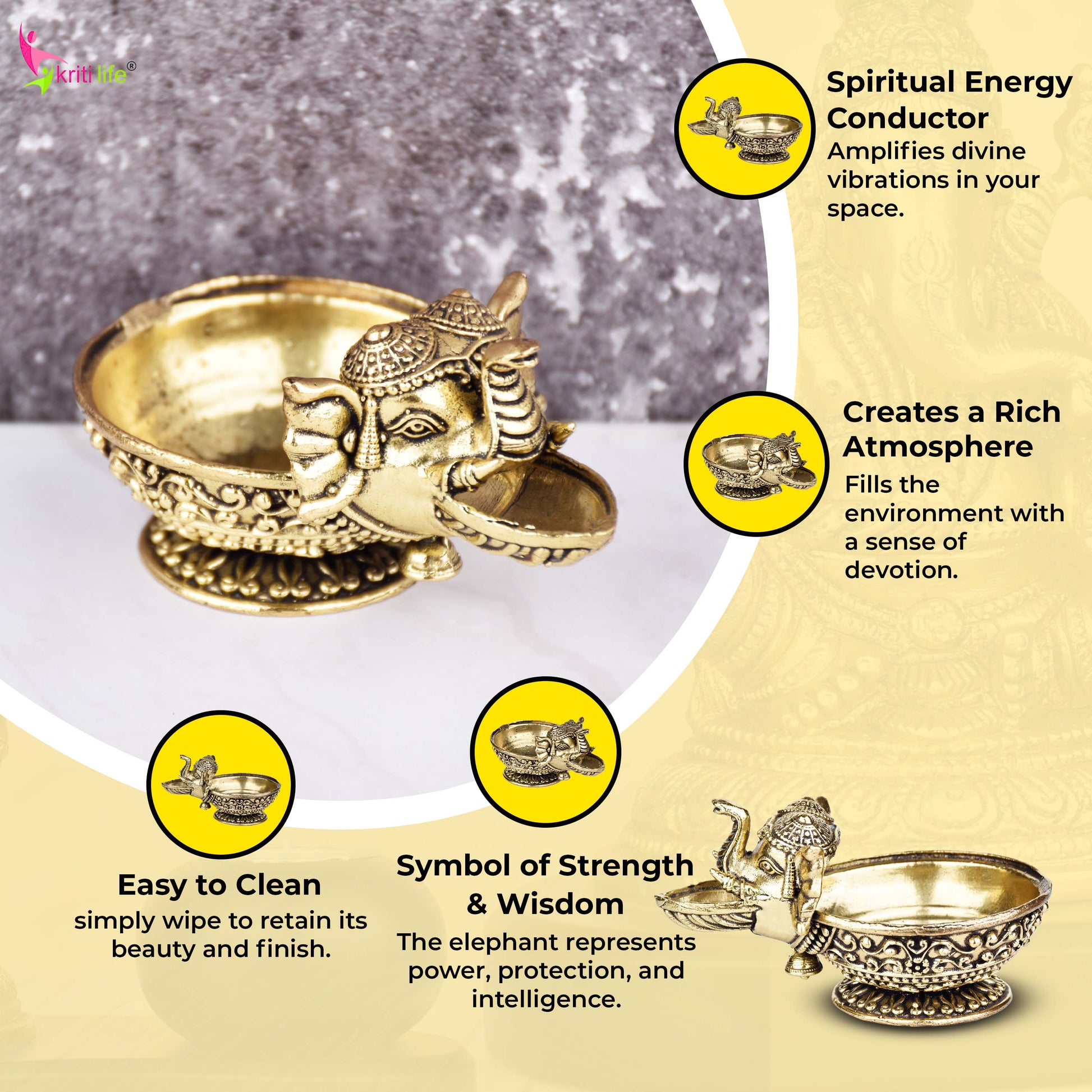 Elevate your spiritual rituals with this beautifully crafted Brass Elephant Face Diya. Designed in the likeness of Lord Ganesha, the remover of obstacles, this diya brings positive energy and divine blessings into your home. The diya bowl is spacious enough to hold oil and a cotton wick, making it ideal for aarti, pooja, and festive lighting.