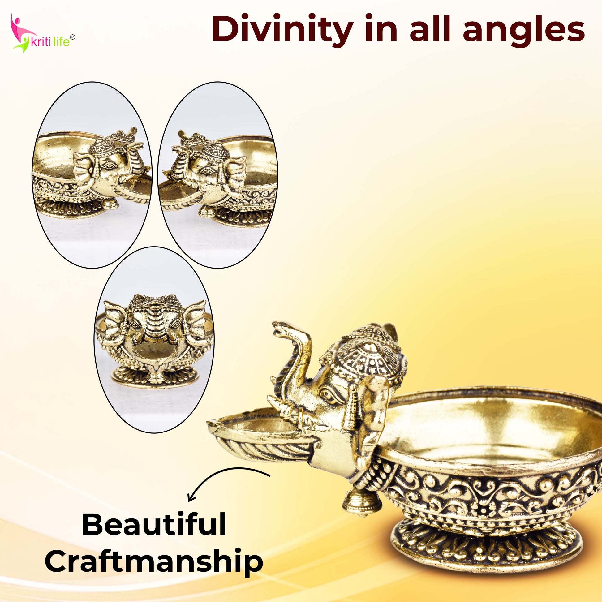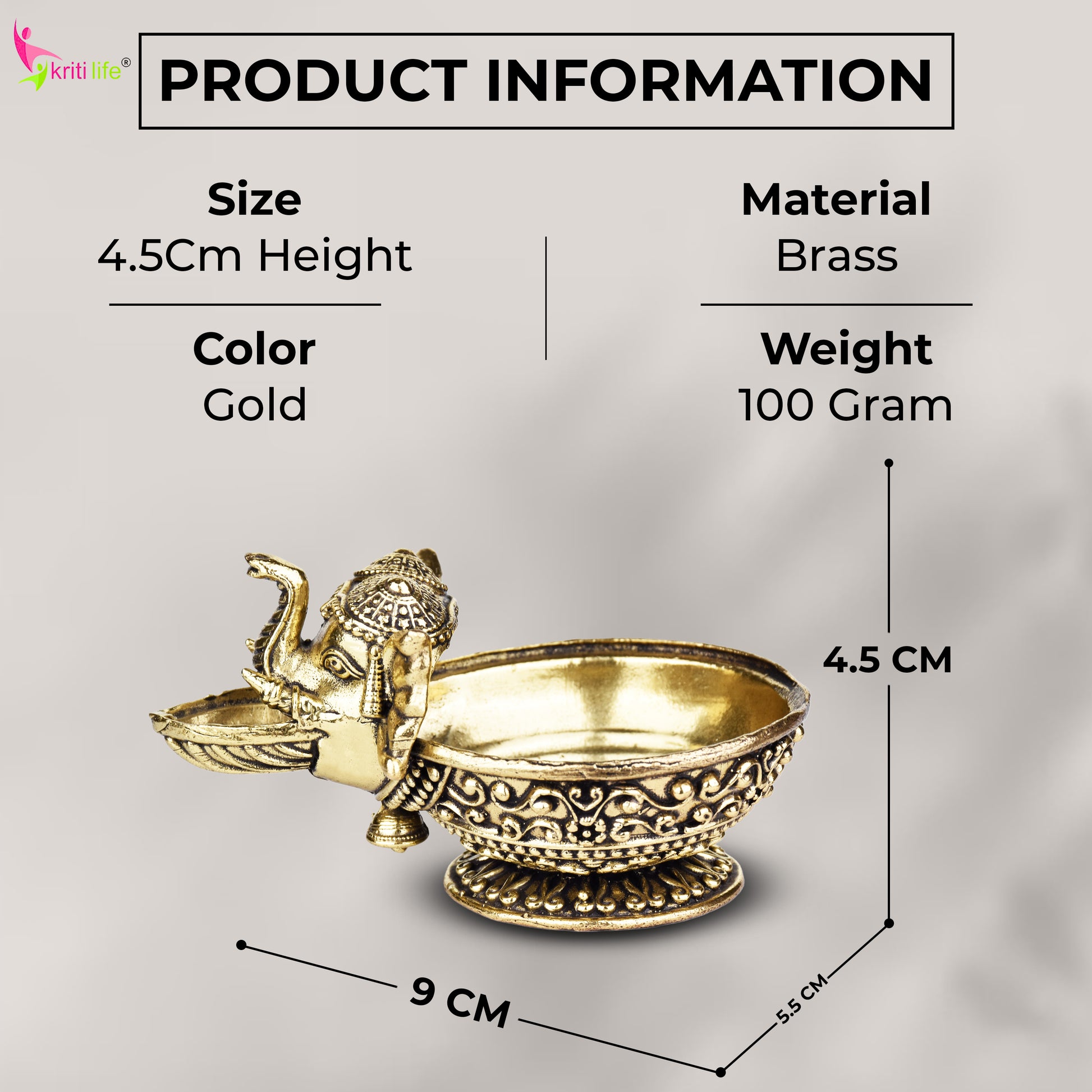 Handcrafted by skilled artisans using premium quality brass, the diya features fine detailing on the Elephant face, adorned with a majestic crown and expressive eyes. Its antique finish adds a regal touch, making it a charming piece for your pooja room or as a spiritual gift.