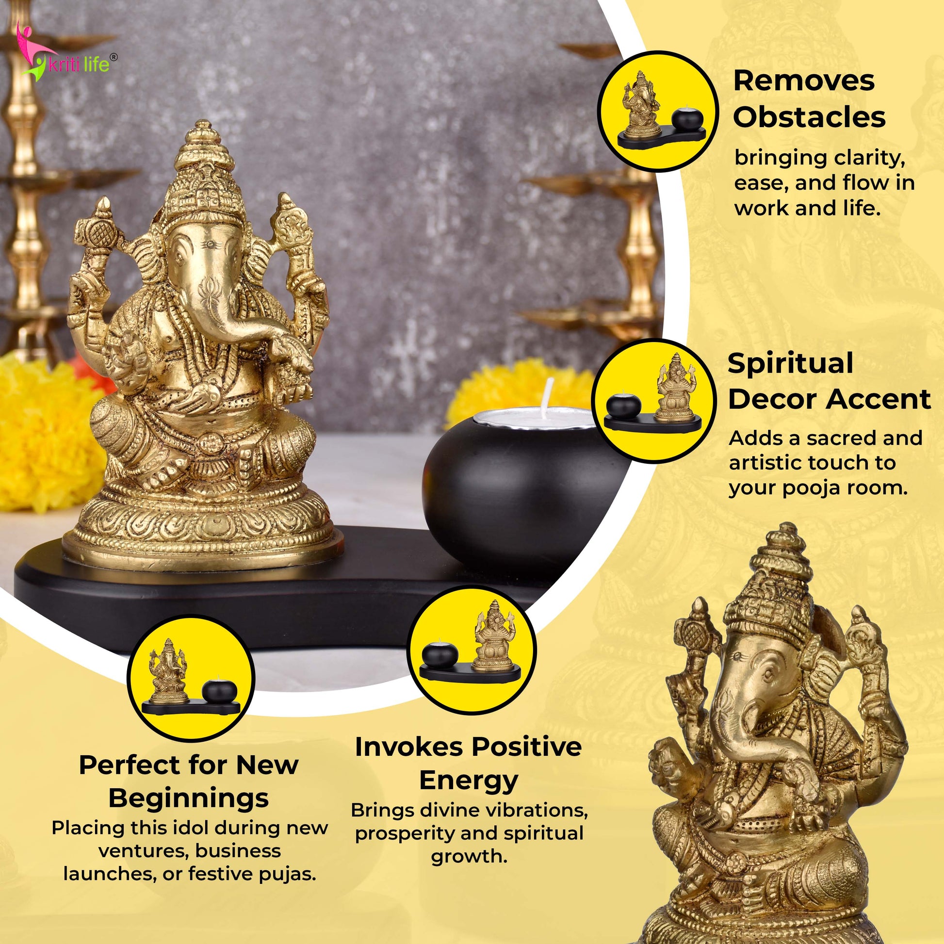 The attached matte-black wooden base holds a round tealight candle holder, making it an ideal decorative accent for your living room, office desk, mandir, or meditation space. Light the candle to create a soothing ambiance during prayer or relaxation.