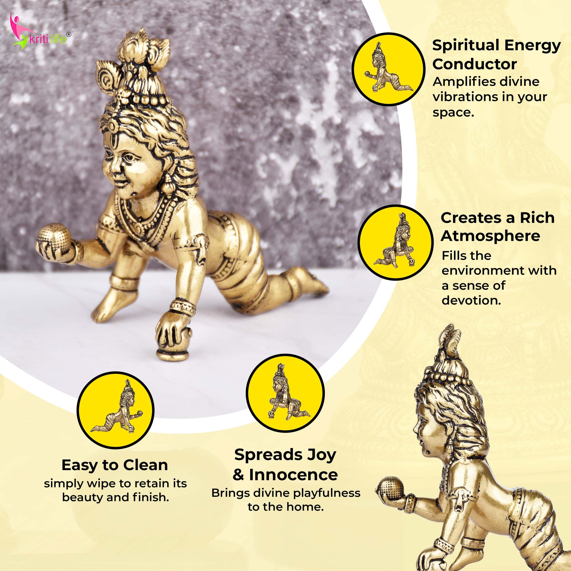 - Spiritual Value – Represents love, protection, and childhood divinity of Lord Krishna.