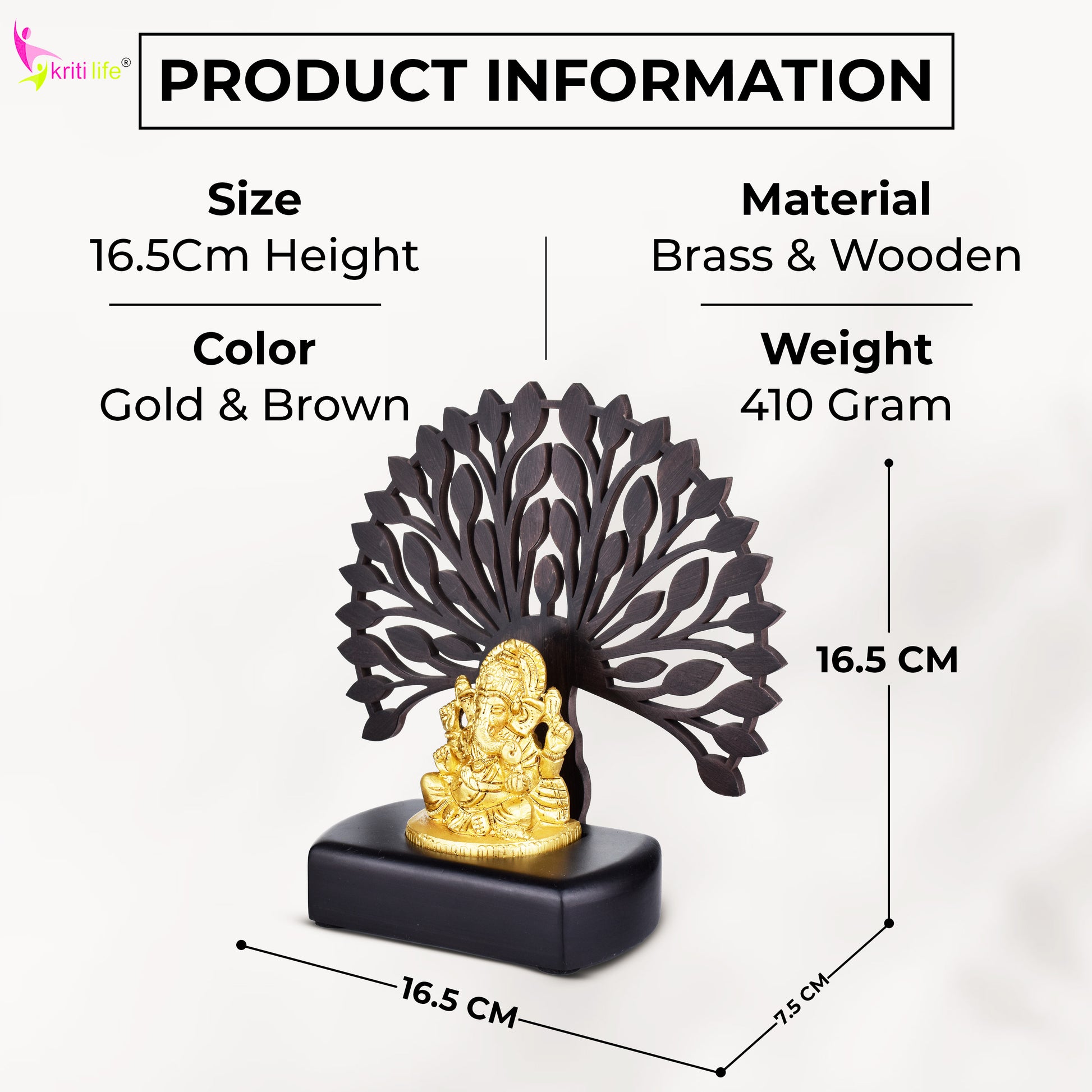 Brass Lord Ganesha Idol with Wooden Tree Backdrop – | 6 inches | Decorative Showpiece for Home & Office