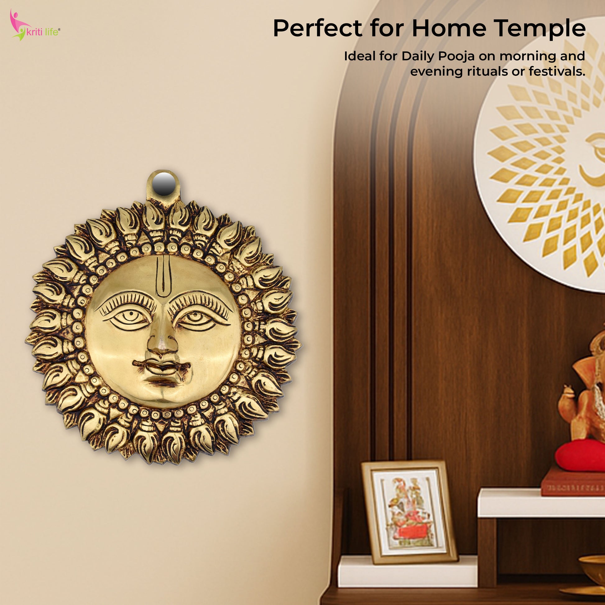 Invite divine energy and positive vibrations into your space with the Kriti Life Brass Surya Wall Hanging. Handcrafted with fine detailing, this piece represents Surya Dev, the Sun God—symbol of energy, vitality, and life force. The expressive facial features and radiant sunburst design make it a standout wall décor for pooja rooms, entrances, and spiritual corners. Made in solid brass, it not only brings grace but also serves as a vastu remedy to eliminate negative energies and bring light and prosperity into your home or office.