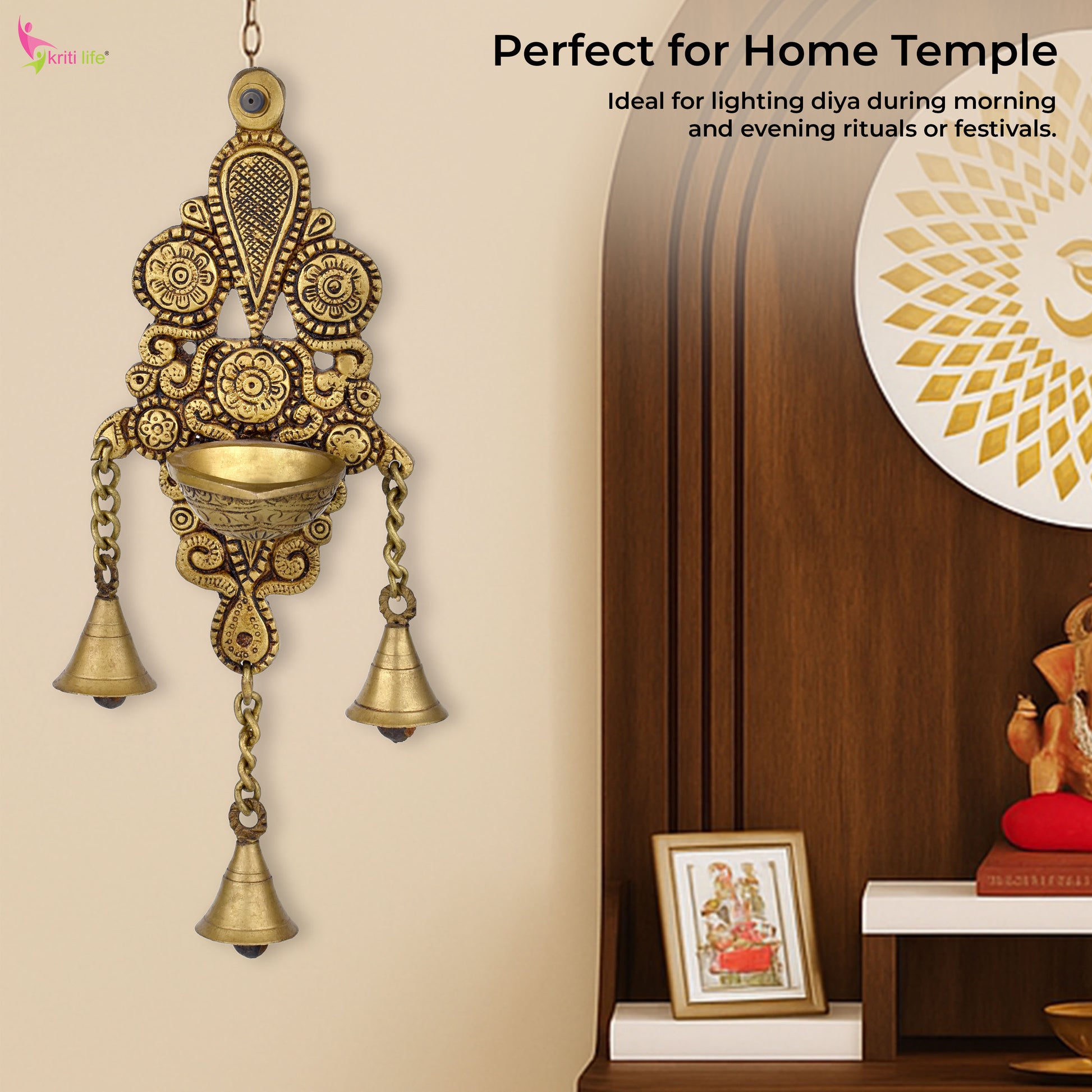 • Pure brass wall-mounted diya with intricate traditional design and 3 hanging bells that enhance both sight and sound during pooja.
