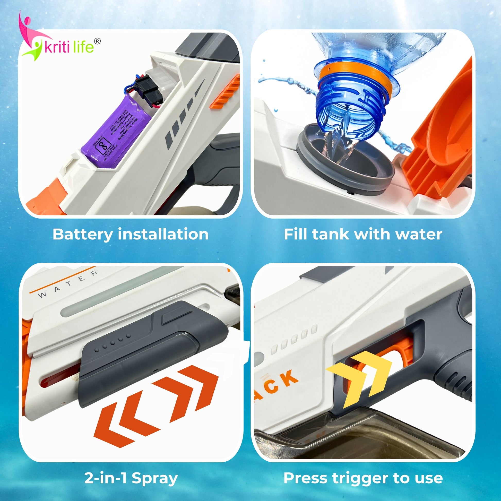 - This is an electric water gun. Do not immerse the battery or charging port in water.