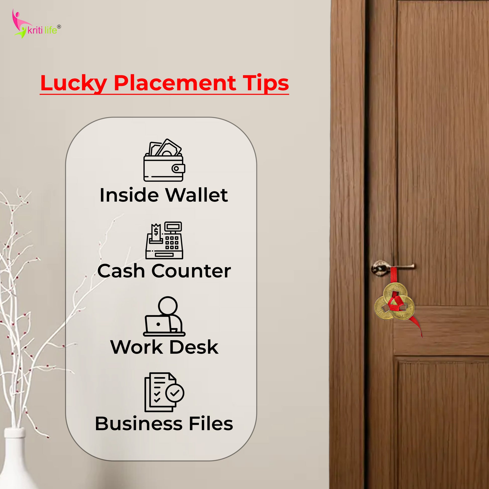 Invite wealth, prosperity, and success into your life with Kriti Life’s Energised Feng Shui 3 Wealth Coins. Tied with a red thread and blessed by Reiki & Feng Shui expert Sharad Goyal, these authentic Chinese coins symbolize heaven, earth, and mankind. Keep them in your wallet, office, cash box, shop counter, or near the main door to activate money luck and positive energy. These coins are not just lucky—they are spiritually energised for faster results. A perfect gift for new businesses, housewarming, Diwali, or anyone starting a new journey.