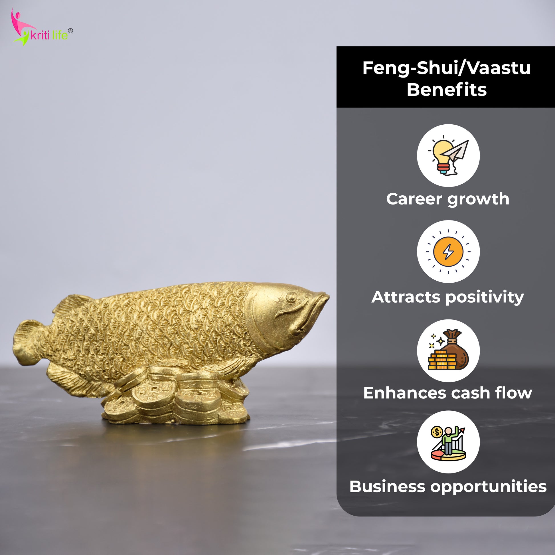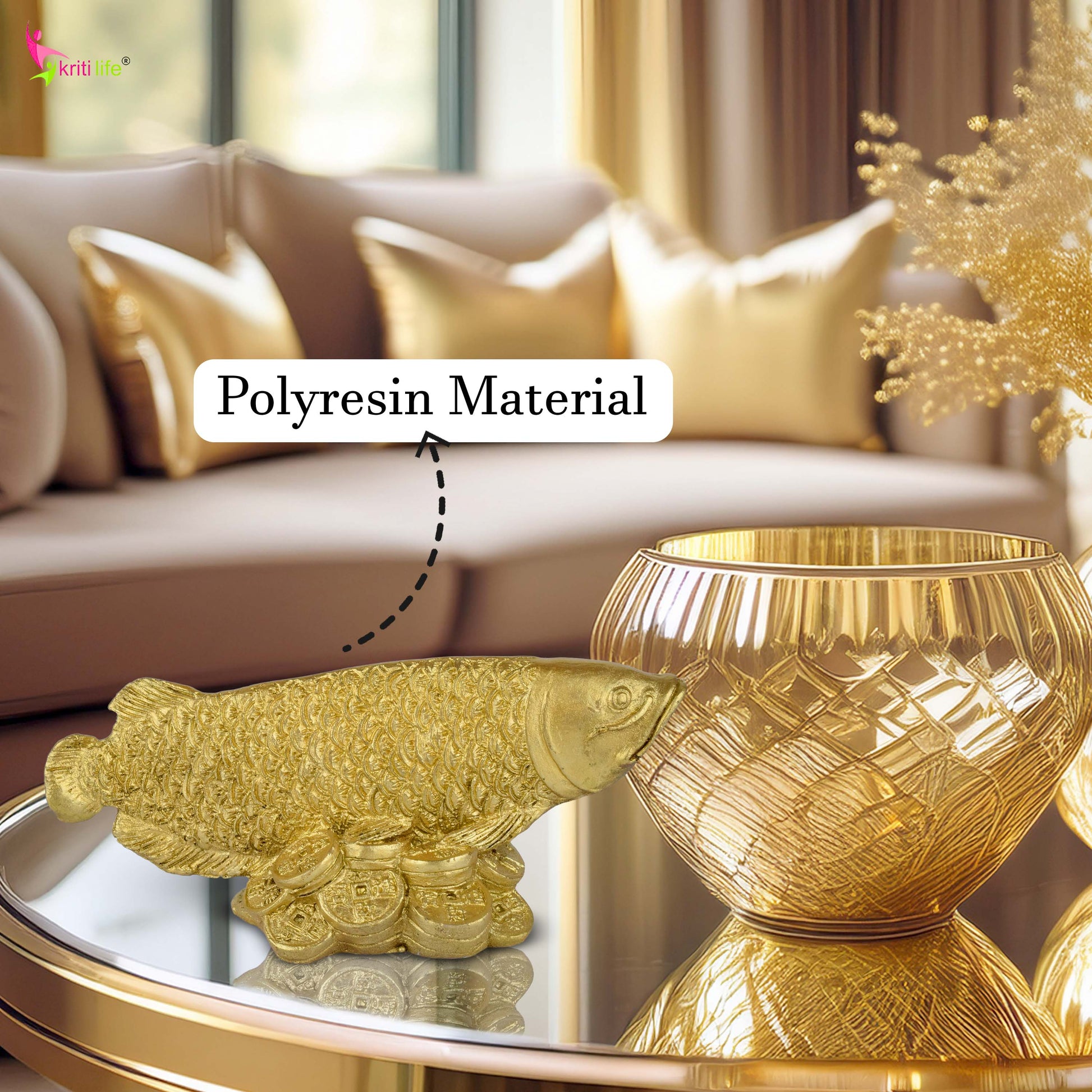 Kriti Life’s Feng Shui Arowana Fish Idol, also known as the Dragon Fish, is a powerful symbol of wealth, career growth, and protection from negative energy. Crafted in radiant golden polyresin, the fish is shown swimming over a bed of ancient Chinese coins — representing continuous flow of money and opportunities.