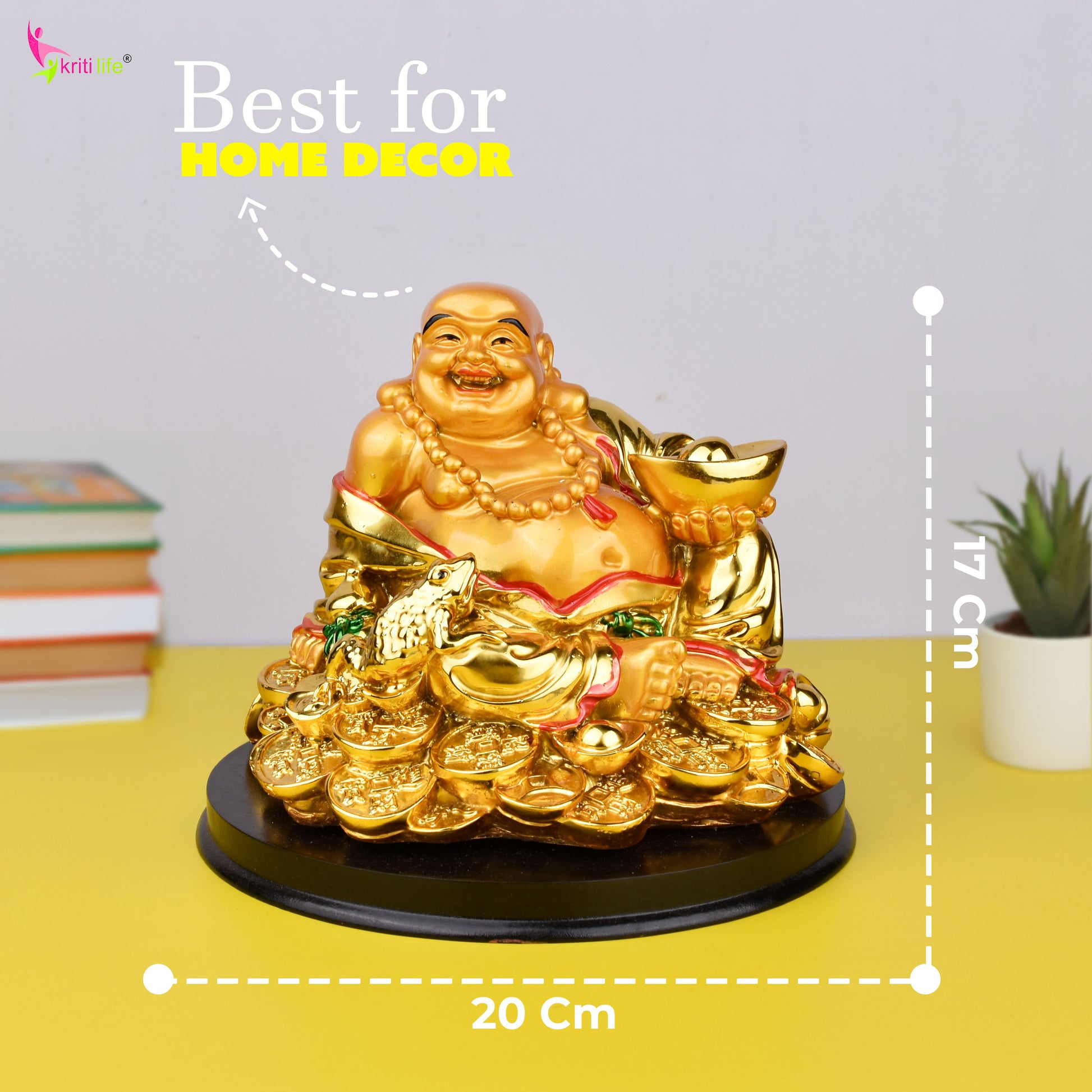 Bring home joy, wealth, and harmony with this beautifully crafted Feng Shui Laughing Buddha Idol with Wealth Bowl. Known as the symbol of happiness and good luck in Feng Shui, this idol is designed to uplift your space with positivity and abundance. Made from premium polyresin with a radiant golden antique finish, it features the Laughing Buddha seated on a pile of gold coins, holding a wealth bowl—inviting prosperity, peace, and laughter into your home or office.