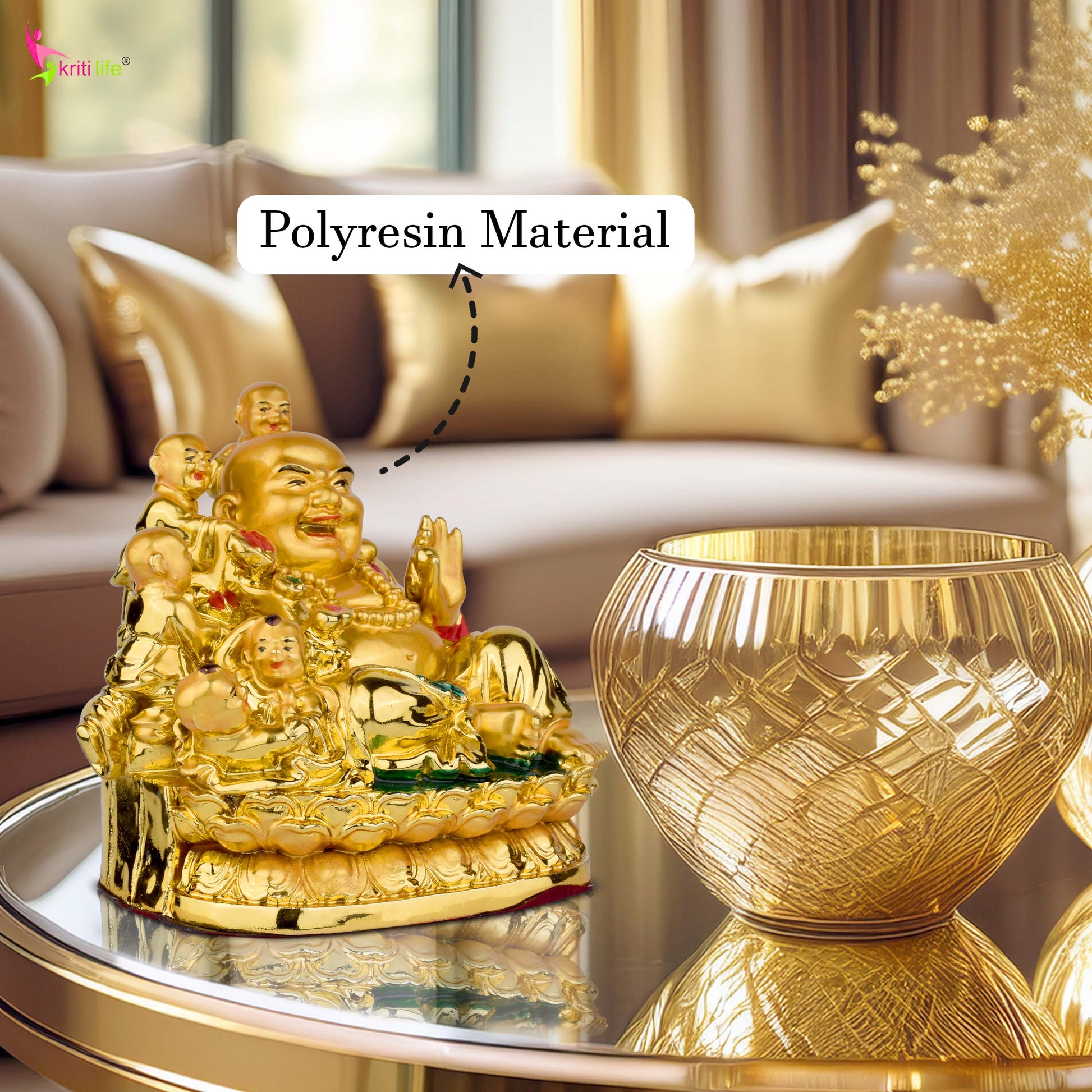 Feng Shui Laughing Buddha with Baby | Golden Polyresin Feng Shui Idol for Happiness, Wealth & Positivity- 4 inches