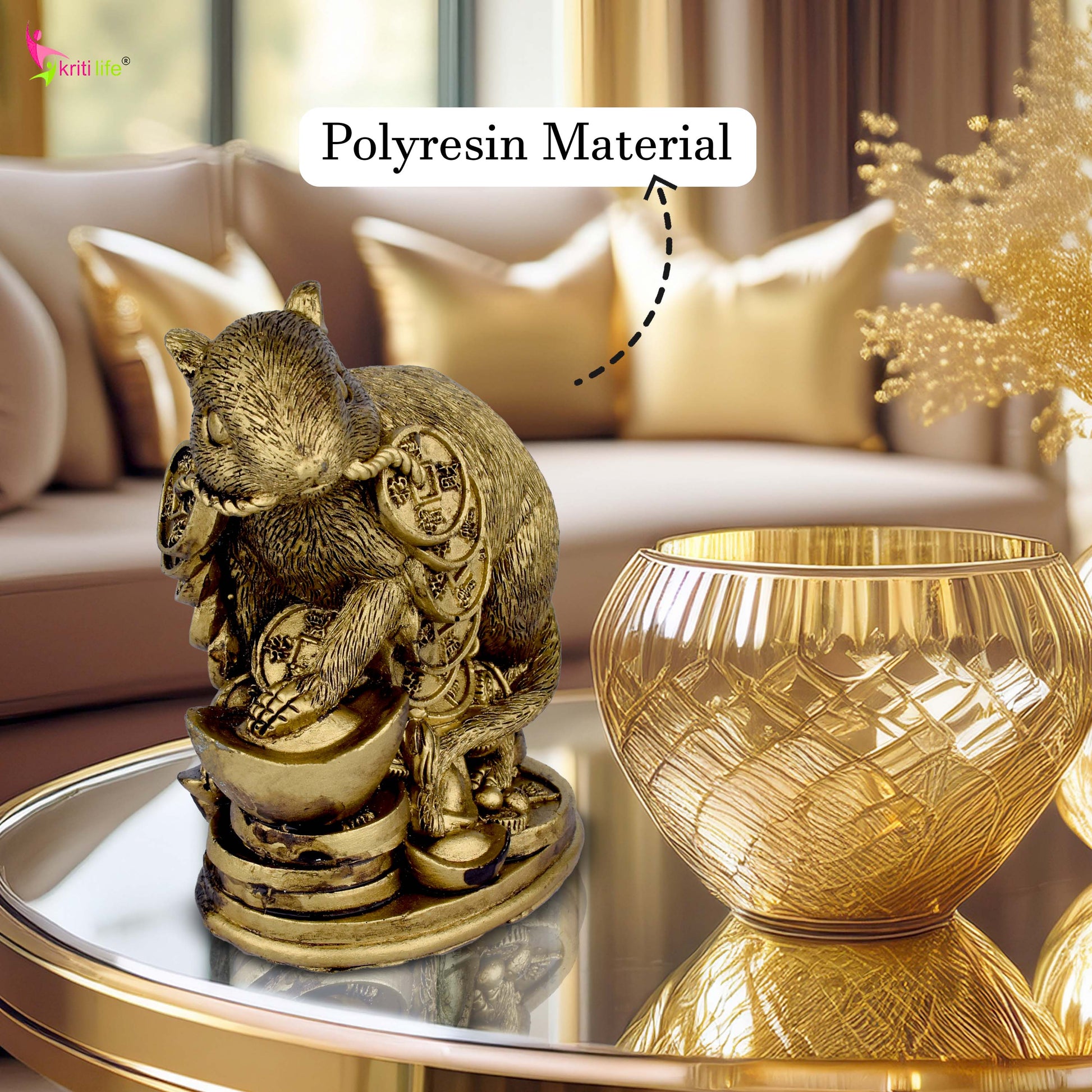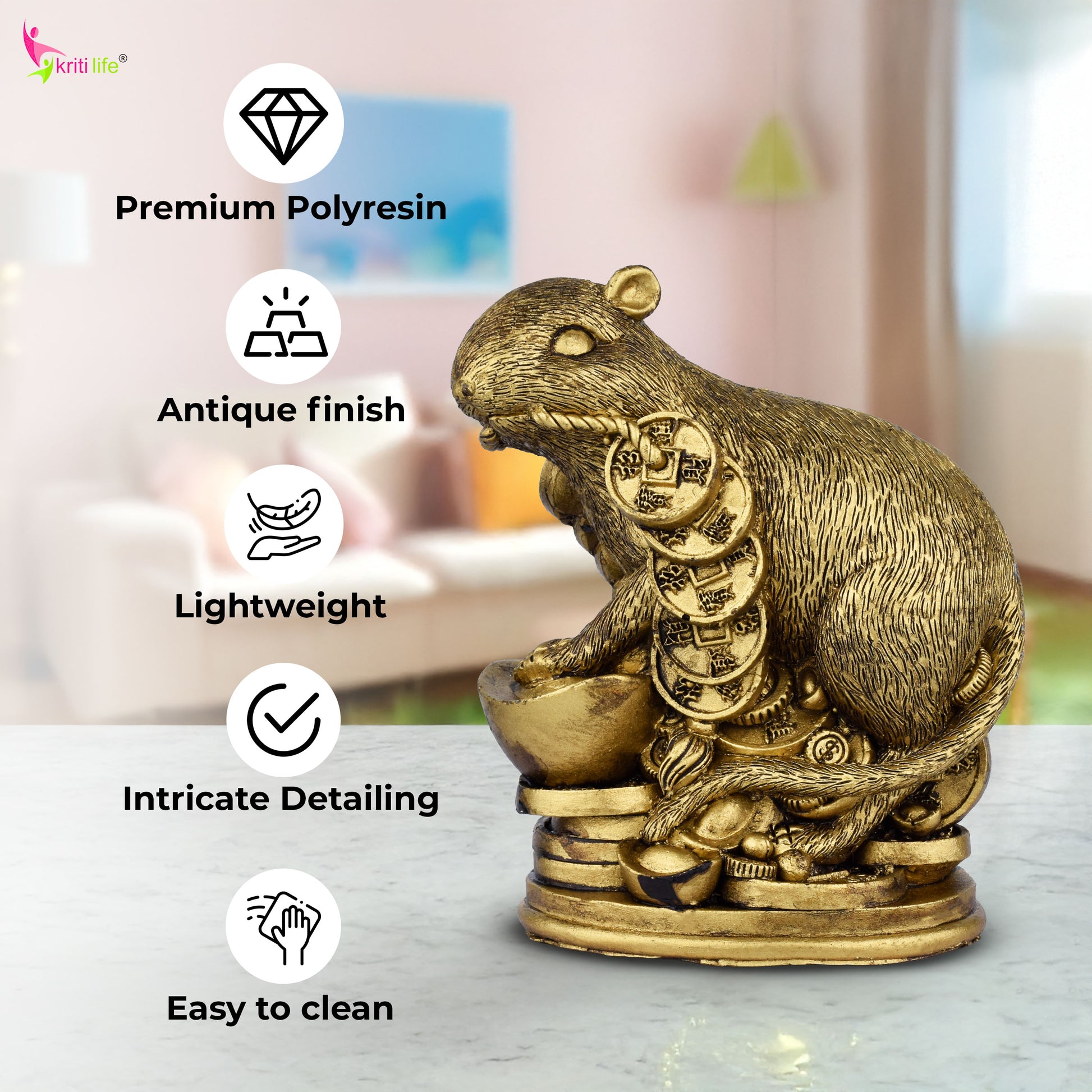 Bring home the powerful symbol of abundance with Kriti Life’s Feng Shui Wealth Rat Idol featuring a gold bar. Made from premium polyresin with an antique gold finish, this intricately crafted idol represents prosperity, savings, and smart accumulation of wealth. The rat is seen sitting atop gold coins and a gold bar — symbolizing not just stored wealth but growing financial stability. According to Feng Shui, placing this idol in the Southeast zone energizes the wealth corner, making it ideal for homes, offices, shops, and especially for entrepreneurs or those born in the Year of the Rat. This piece is a perfect Vastu and Feng Shui enhancer to protect, prosper, and grow your financial fortune.