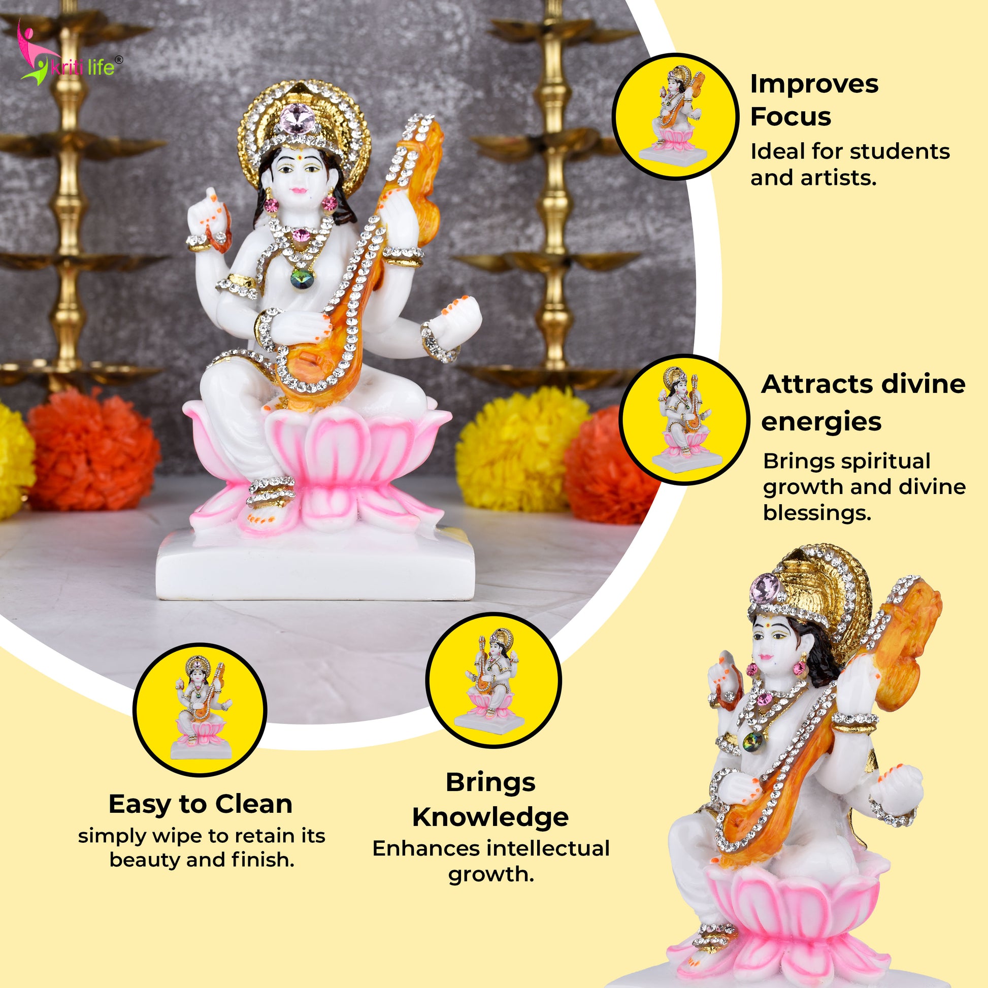 Bring wisdom, creativity, and divine grace into your home with this beautifully crafted Goddess Saraswati idol. Made with high-quality polyresin, this idol showcases Maa Saraswati seated on a blooming pink lotus, holding her signature musical instrument, the veena. Embellished with sparkling stones and fine gold accents, this idol adds a spiritual and elegant touch to any space. Ideal for your home temple, study room, office desk, or as a thoughtful gift for students and seekers of knowledge, this decorative piece blends spiritual significance with aesthetic appeal.