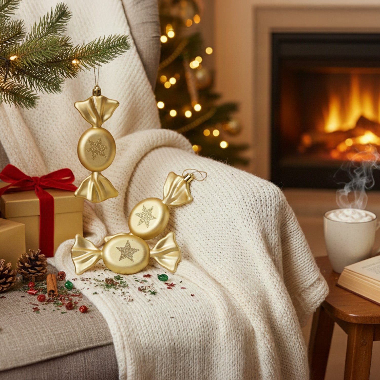 These premium candy-shaped hangings come in a stunning metallic gold finish with a glitter star accent, adding instant sparkle to any Christmas setup. Lightweight, durable, and easy to hang, they enhance your tree, wreaths, hampers, gift boxes, table décor, and festive displays effortlessly.