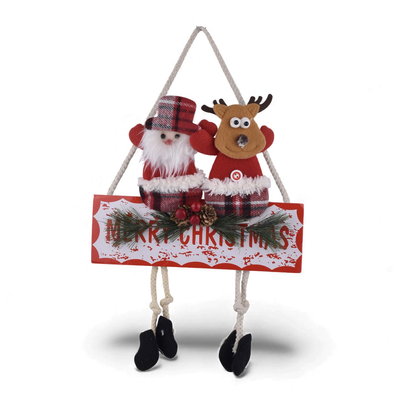 Featuring cute dangling legs, a “Merry Christmas” board, plaid winter outfits, pinecone accents and a sturdy hanging rope, this decor piece adds a beautiful welcoming touch. Perfect for doors, walls, mirrors, fireplaces and Christmas trees. A must-have for festive styling and gifting.