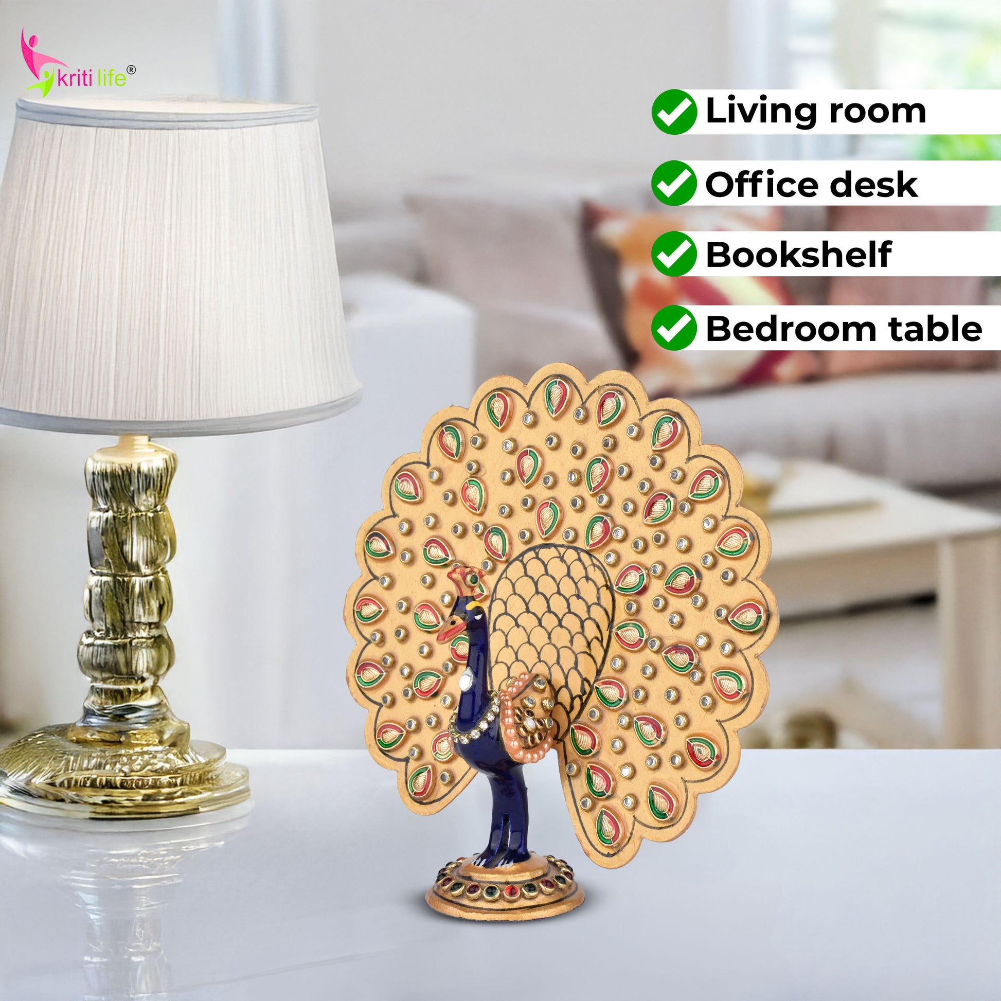 Bring home the charm and royalty of Indian decor with this Handcrafted Aluminium Peacock Showpiece by Kriti Life. Designed with an intricately carved open feather fan and studded with vibrant colors and stones, this masterpiece is made from premium aluminium. Hand-painted in traditional shades of gold, blue, red, and green, this peacock symbolizes beauty, grace, and prosperity. Ideal for home décor, temple space, gifting, or festive decoration, it adds a majestic touch to your surroundings. A true blend of Indian craftsmanship and ethnic elegance.