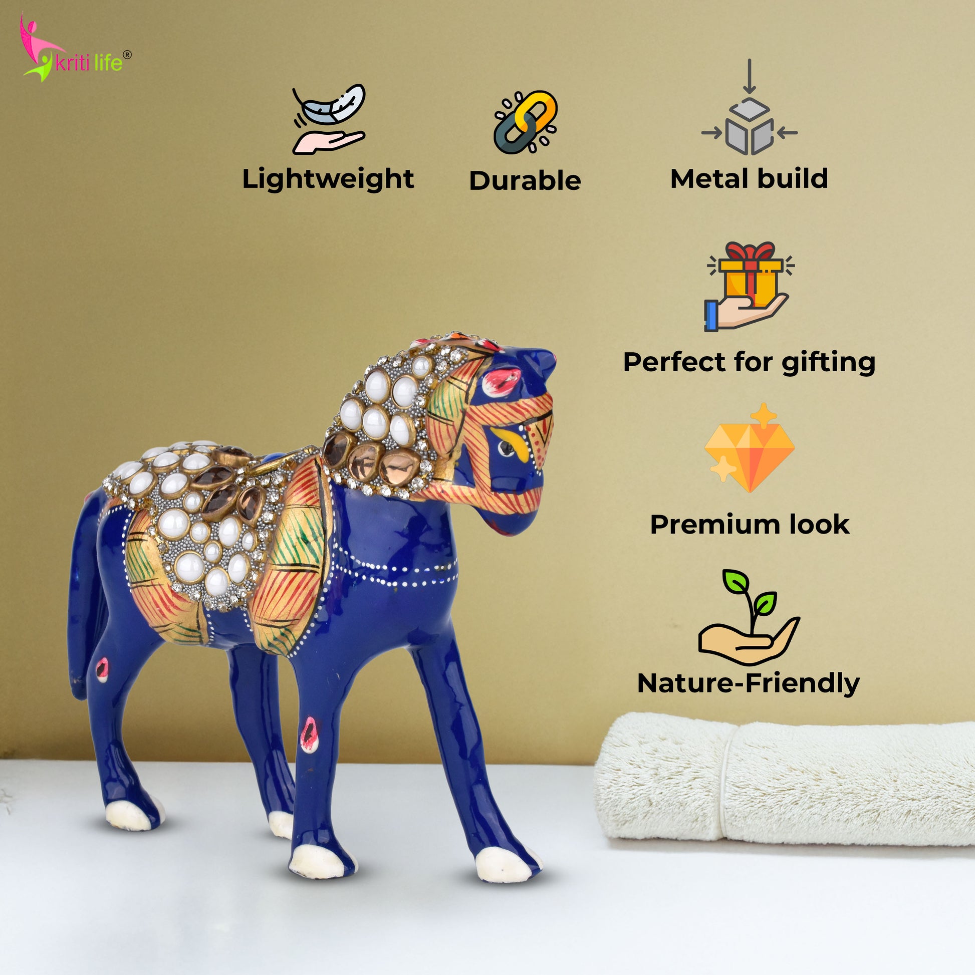 Elevate your home with the Kriti Life Handcrafted Royal Horse Showpiece, made from premium aluminium and designed to reflect royalty, power, and grace. Beautifully hand-painted in deep royal blue with multicolor enamel detailing, this figurine is adorned with sparkling imitation stones and fine miniature accents. Perfect for ethnic home décor, pooja corners, and even corporate gifting, this horse represents progress, success, and strength. Crafted by Indian artisans, it adds traditional elegance to any space.