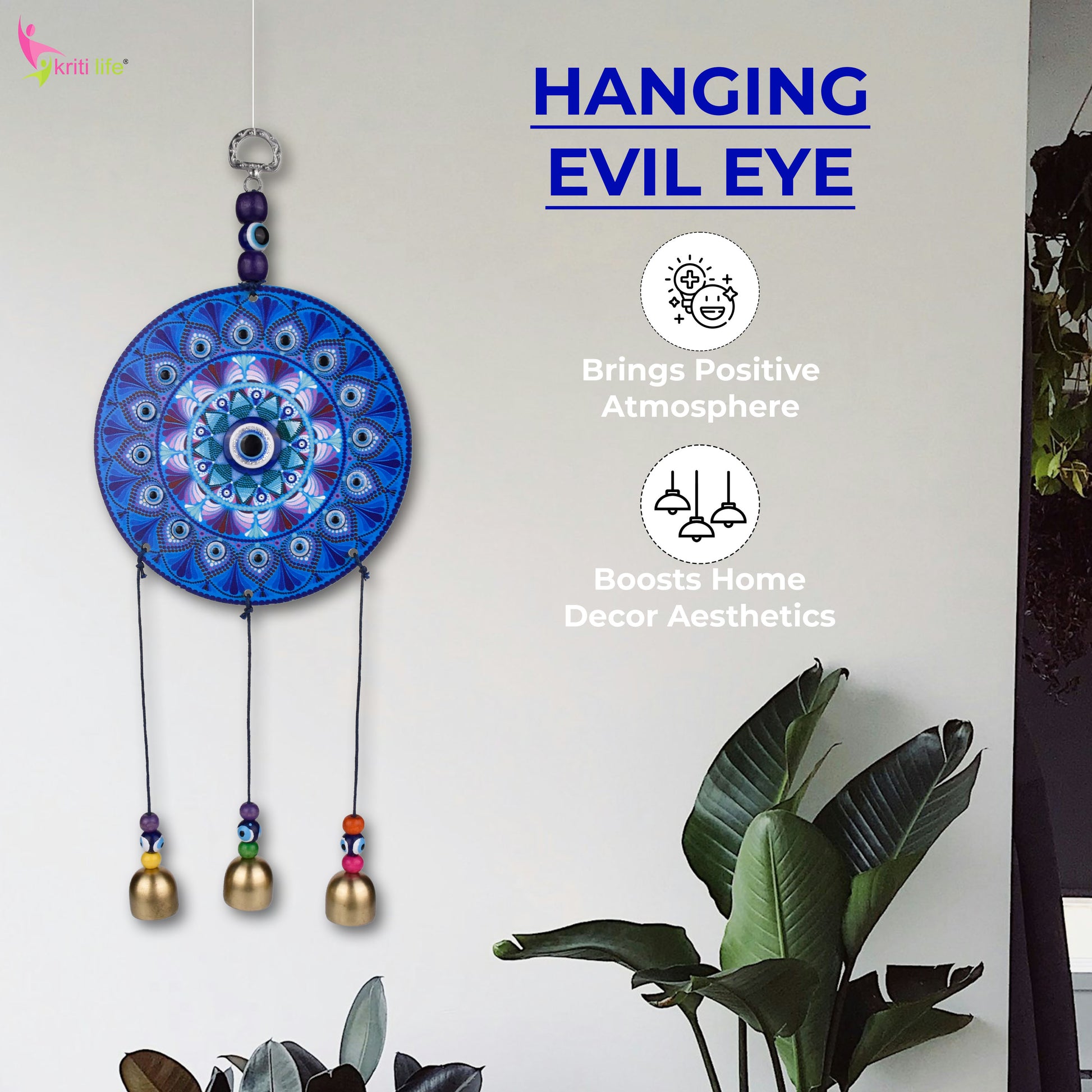Add powerful protection and aesthetic charm to your space with the Kriti Life Hanging Evil Eye Wall Decor. Featuring a vibrant blue mandala centerpiece with intricate detailing, colorful beads, and three elegant hanging bells, this evil eye wall hanging not only deflects negative energy but also elevates your interior décor. Ideal for doorways, living rooms, balconies, offices, or meditation spaces, it brings a spiritual vibe while enhancing positivity. Made with care and crafted to perfection, it's a unique blend of beauty, belief, and tradition.
