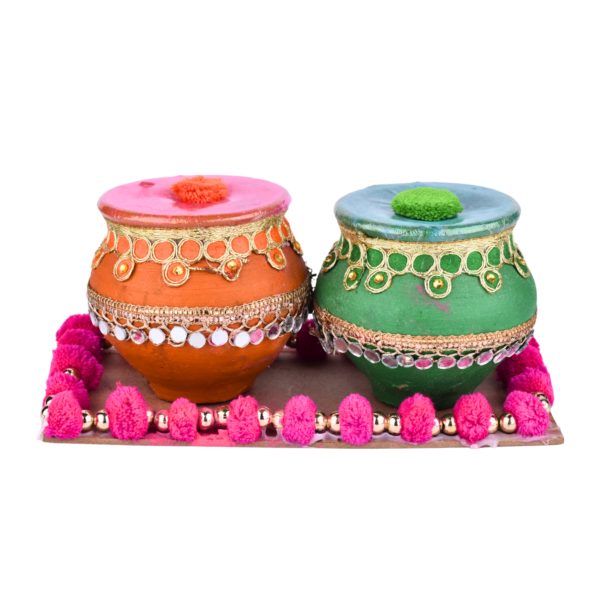 This set includes two decorative mataki-style pots fixed on a decorative base, specially designed to hold dry gulal during Holi rituals, family gatherings and festive décor setups. The vibrant colours, mirror work, beads and soft pom-pom detailing give a rich ethnic look that enhances your Holi décor instantly.