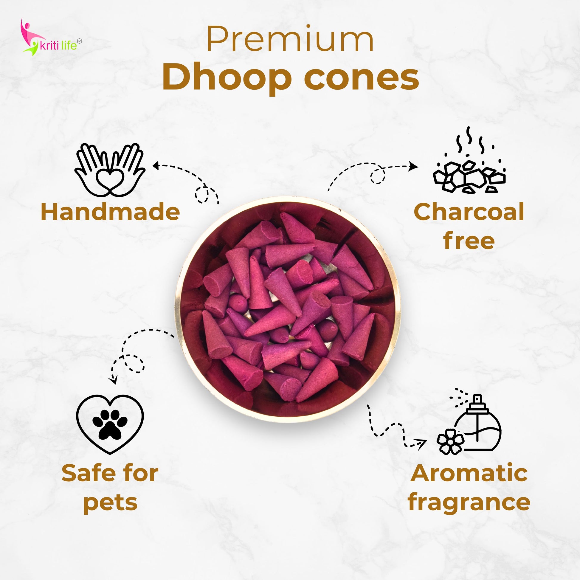 Kriti Life incense cones are thoughtfully crafted to bring a serene and refreshing aroma to your space. Each pack contains approximately 150 handmade cones, each measuring 2.5 cm in height with a 0.5 cm base diameter. Designed for long-term use, these cones are carefully packed to preserve their quality and natural fragrance. With a burn time of up to 20 minutes per cone, they create a calming atmosphere ideal for Puja, Hawan, meditation, yoga, or everyday home fragrance. Made using natural, charcoal-free ingredients, these eco-friendly incense cones produce minimal smoke while delivering a soothing, long-lasting aroma—perfect for enhancing peace, purifying the air, and elevating your daily rituals.