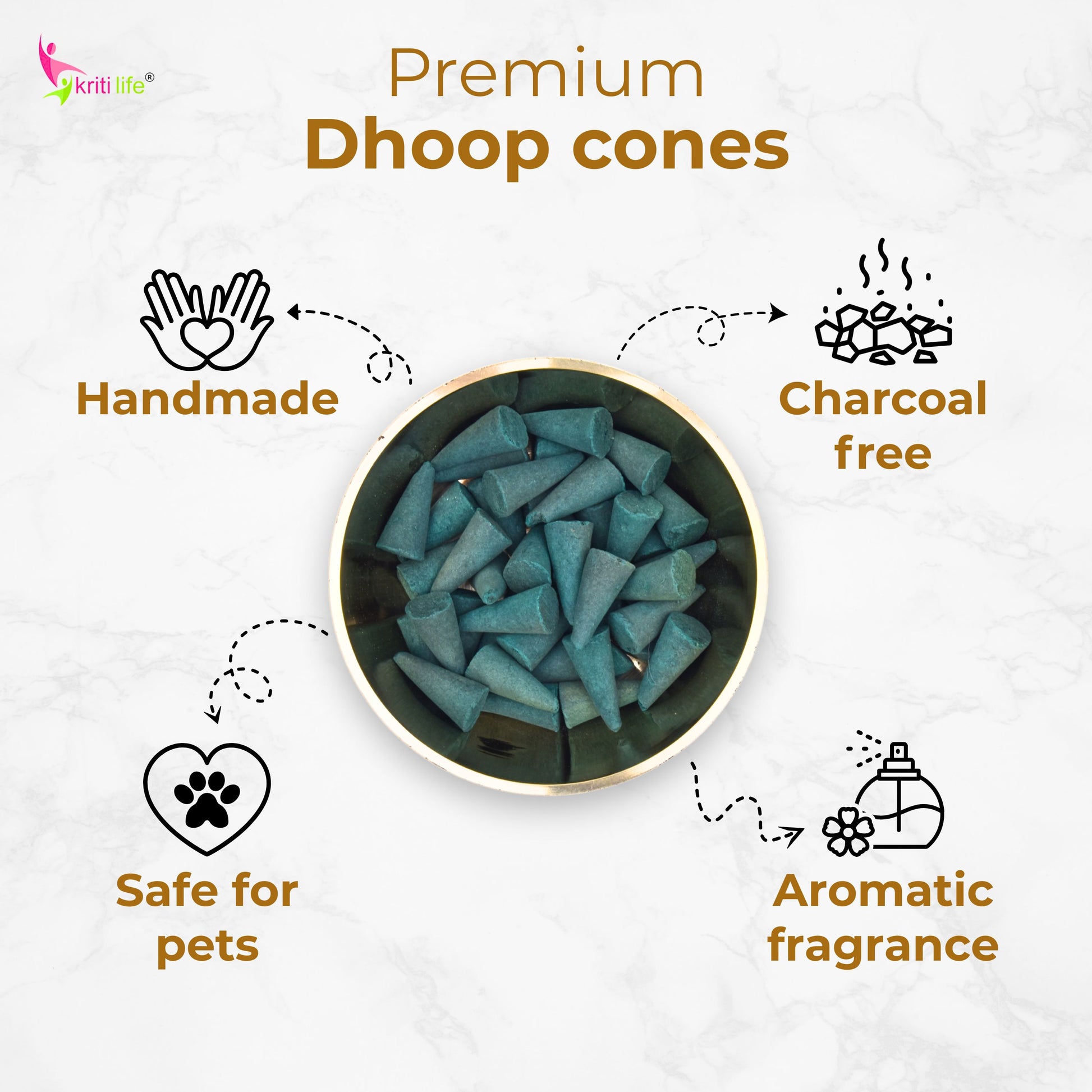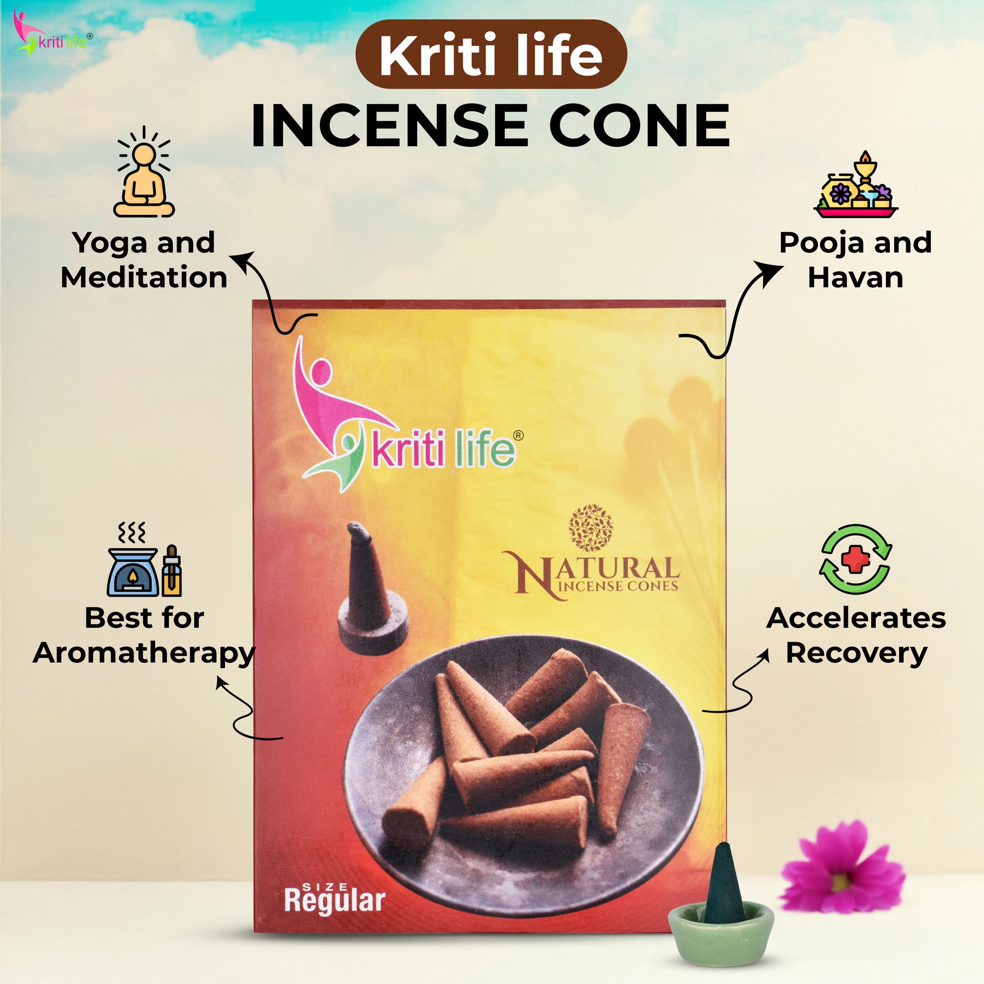 Kriti Life incense cones are thoughtfully crafted to bring a serene and refreshing aroma to your space. Each pack contains approximately 150 handmade cones, each measuring 2.5 cm in height with a 0.5 cm base diameter. Designed for long-term use, these cones are carefully packed to preserve their quality and natural fragrance. With a burn time of up to 20 minutes per cone, they create a calming atmosphere ideal for Puja, Hawan, meditation, yoga, or everyday home fragrance. Made using natural, charcoal-free ingredients, these eco-friendly incense cones produce minimal smoke while delivering a soothing, long-lasting aroma—perfect for enhancing peace, purifying the air, and elevating your daily rituals.