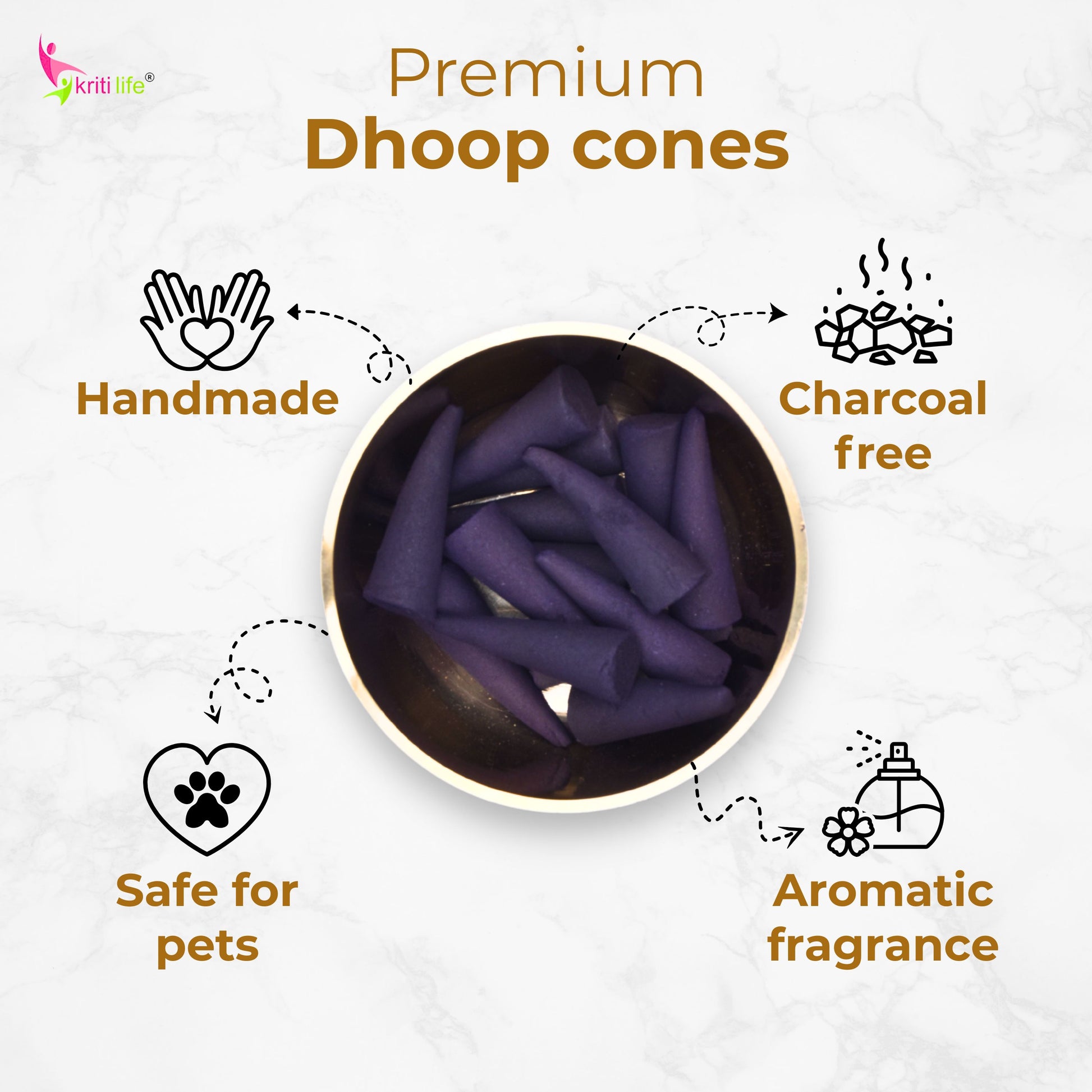 Kriti Life incense cones are thoughtfully crafted to bring a serene and refreshing aroma to your space. Each pack contains approximately 60 handmade cones, each measuring 5 cm in height with a 1.5 cm base diameter. Designed for long-term use, these cones are carefully packed to preserve their quality and natural fragrance. With a burn time of up to 40 minutes per cone, they create a calming atmosphere ideal for Puja, Hawan, meditation, yoga, or everyday home fragrance. Made using natural, charcoal-free ingredients, these eco-friendly incense cones produce minimal smoke while delivering a soothing, long-lasting aroma- perfect for enhancing peace, purifying the air, and elevating your daily rituals.