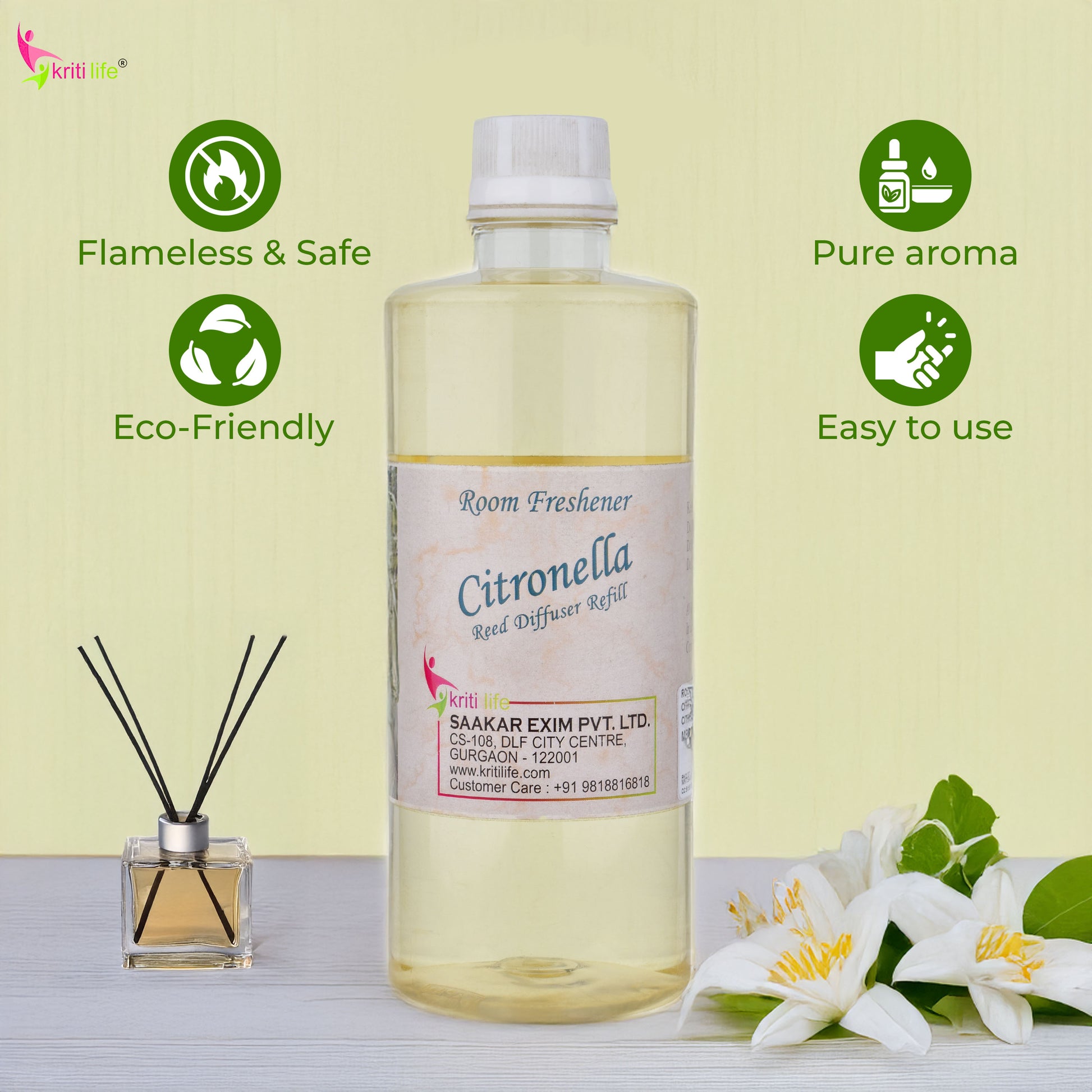 Kriti Life Reed Diffuser Refill - Citronella 450ML Long-Lasting Room Fragrance