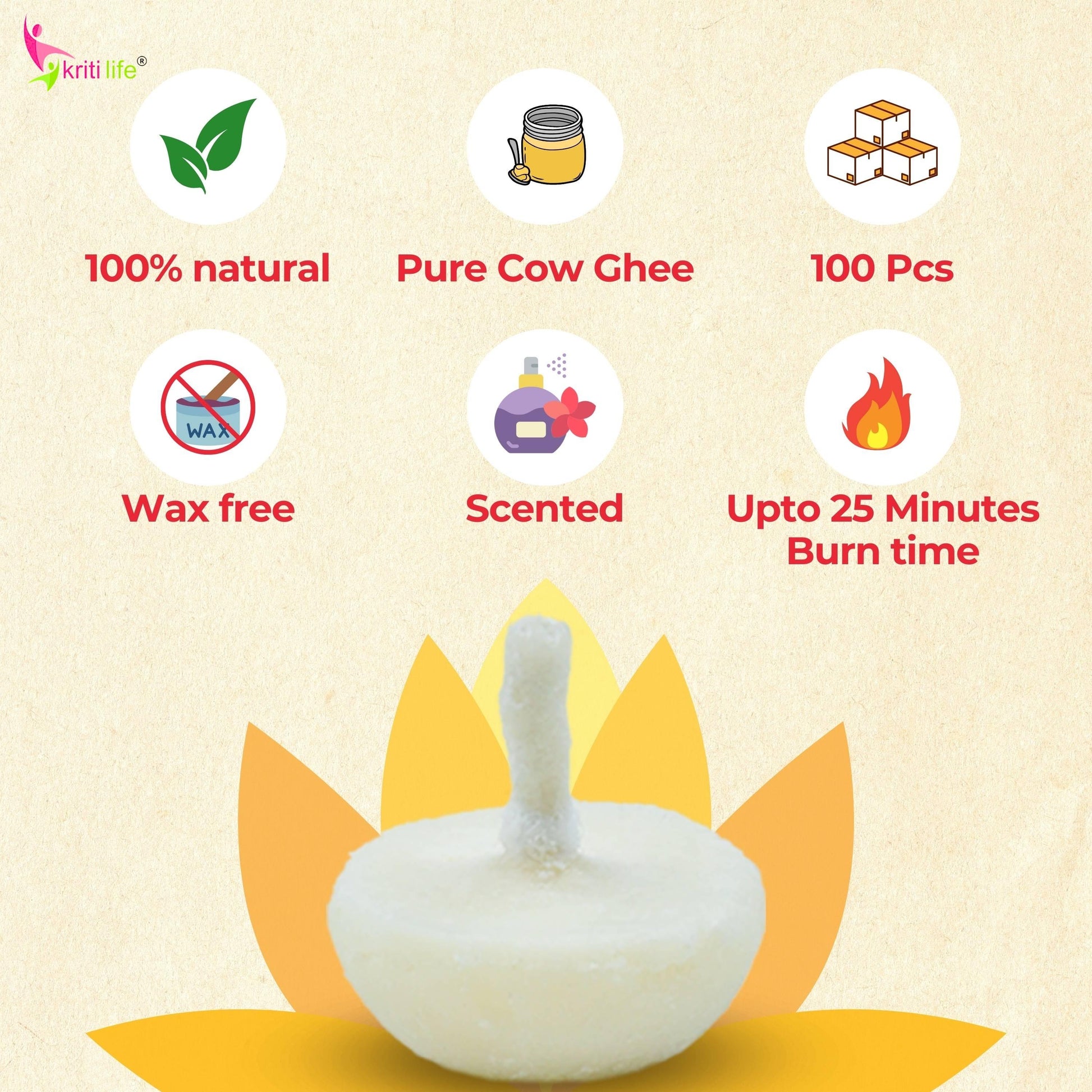 Kriti Life Scented Ghee Jyot Batti - Chandan 100 Pcs for Puja Rituals
