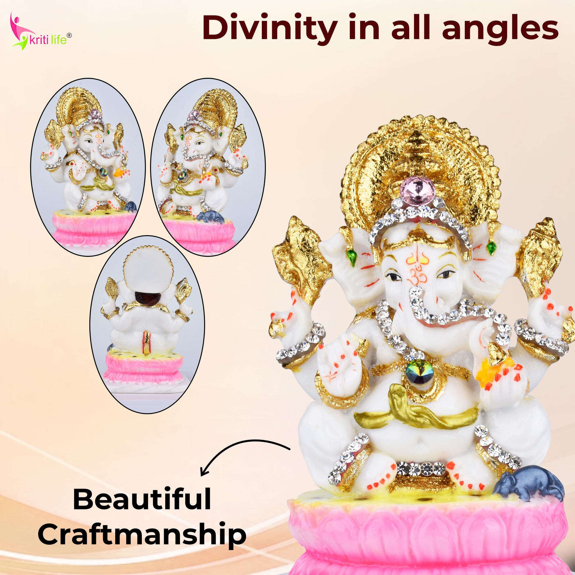 Lord Ganesha Idol – Decorative Polyresin Statue with Stones & Pink Lotus Base - 5.5 inches