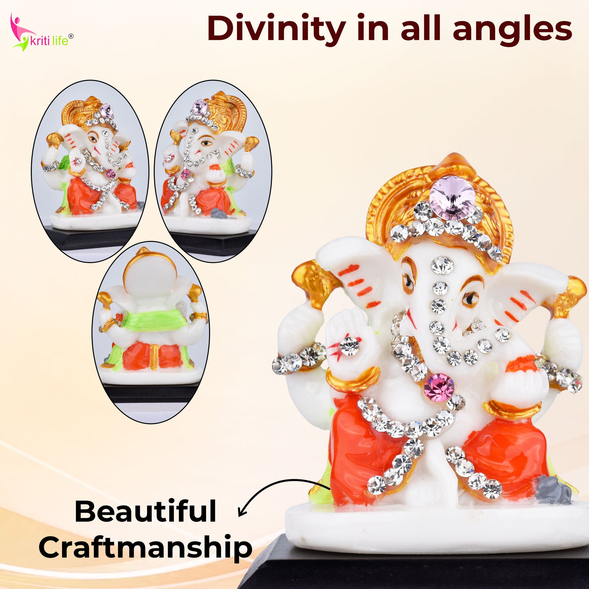 - Design: Ganesha with golden crown, orange attire, and crystal embellishments