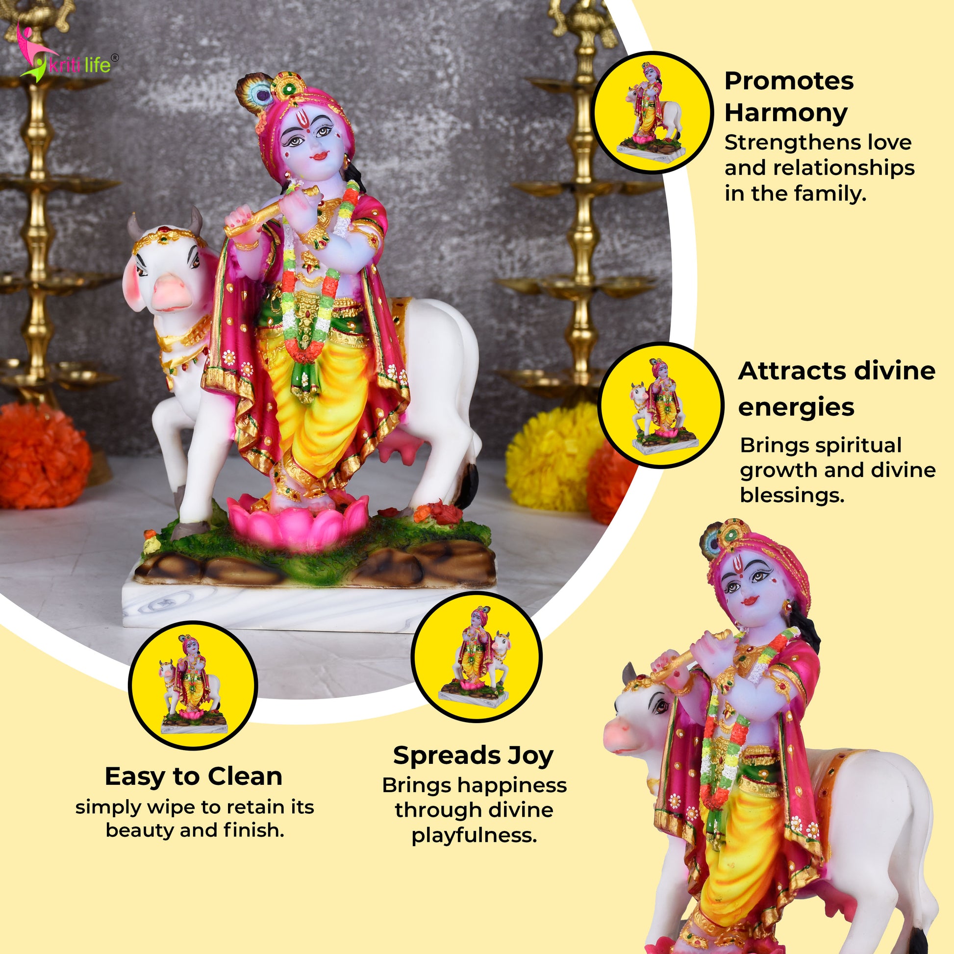 - Depicts Lord Krishna playing flute beside his cow