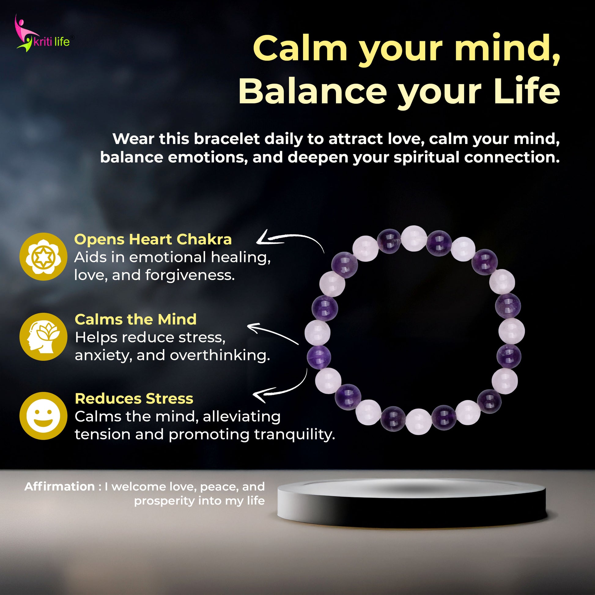 Infused with the calming energy of Amethyst and the nurturing vibrations of Rose Quartz, this bracelet is energized by Reiki, Vaastu, and Feng Shui masters to help you attract love, soothe emotional wounds, and relieve stress