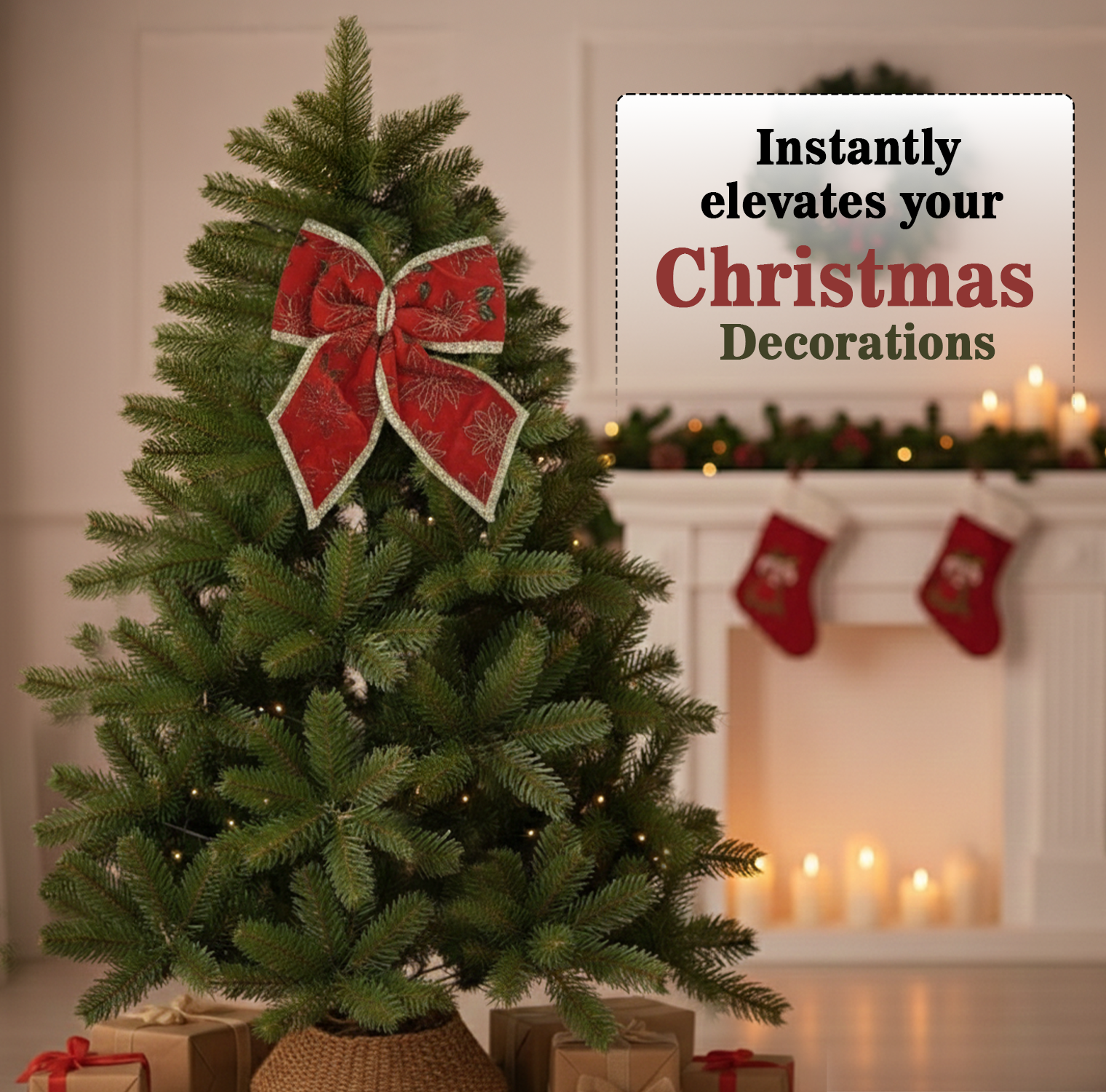 Bring festive charm to your Christmas décor with our Premium Red Fabric Christmas Bow. Designed with a sparkling finish and elegant ribbon shape, this decorative bow instantly enhances the beauty of Christmas trees, wreaths, gift boxes, doors, and holiday displays.
