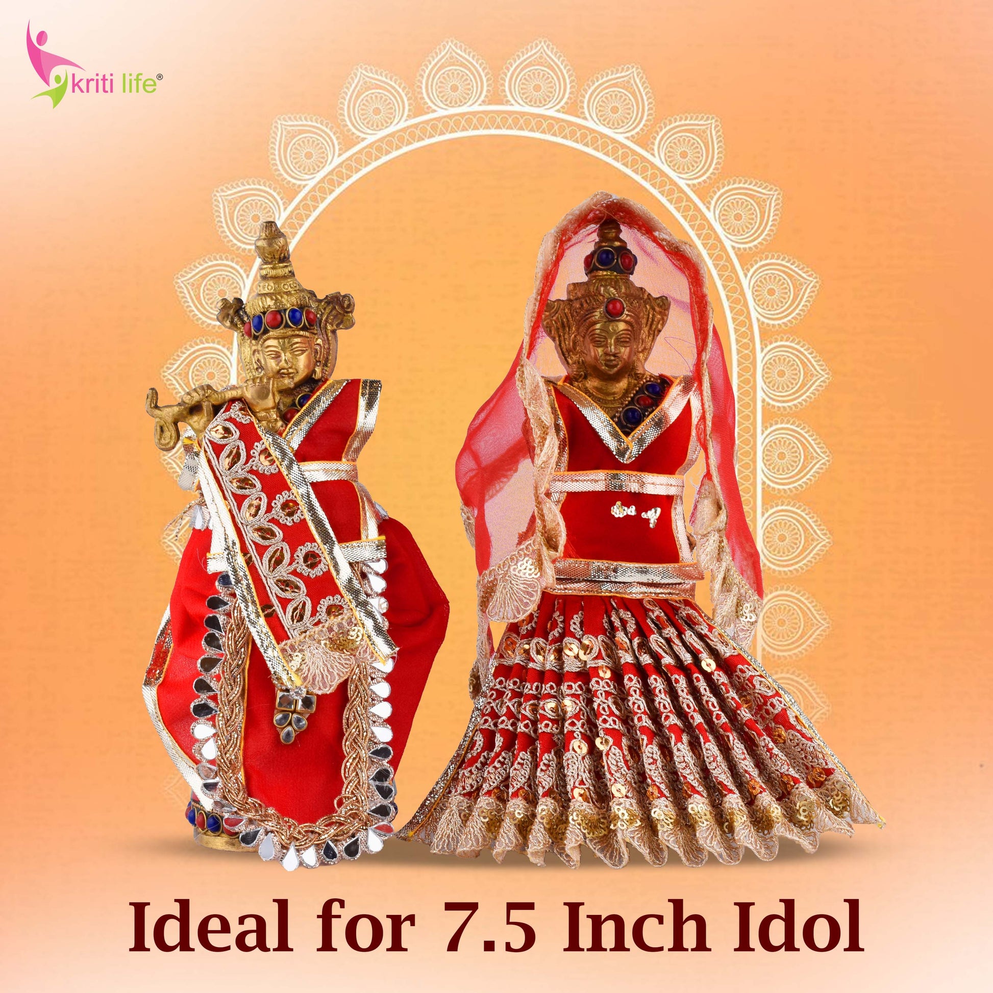 Dress your divine idols of Radha and Krishna in this beautifully handcrafted red vastra set by Kriti Life. Designed specifically for 7.5-inch idols, this traditional dress set is made using rich red fabric, highlighted with shimmering golden lace, zari embroidery, and mirror work.