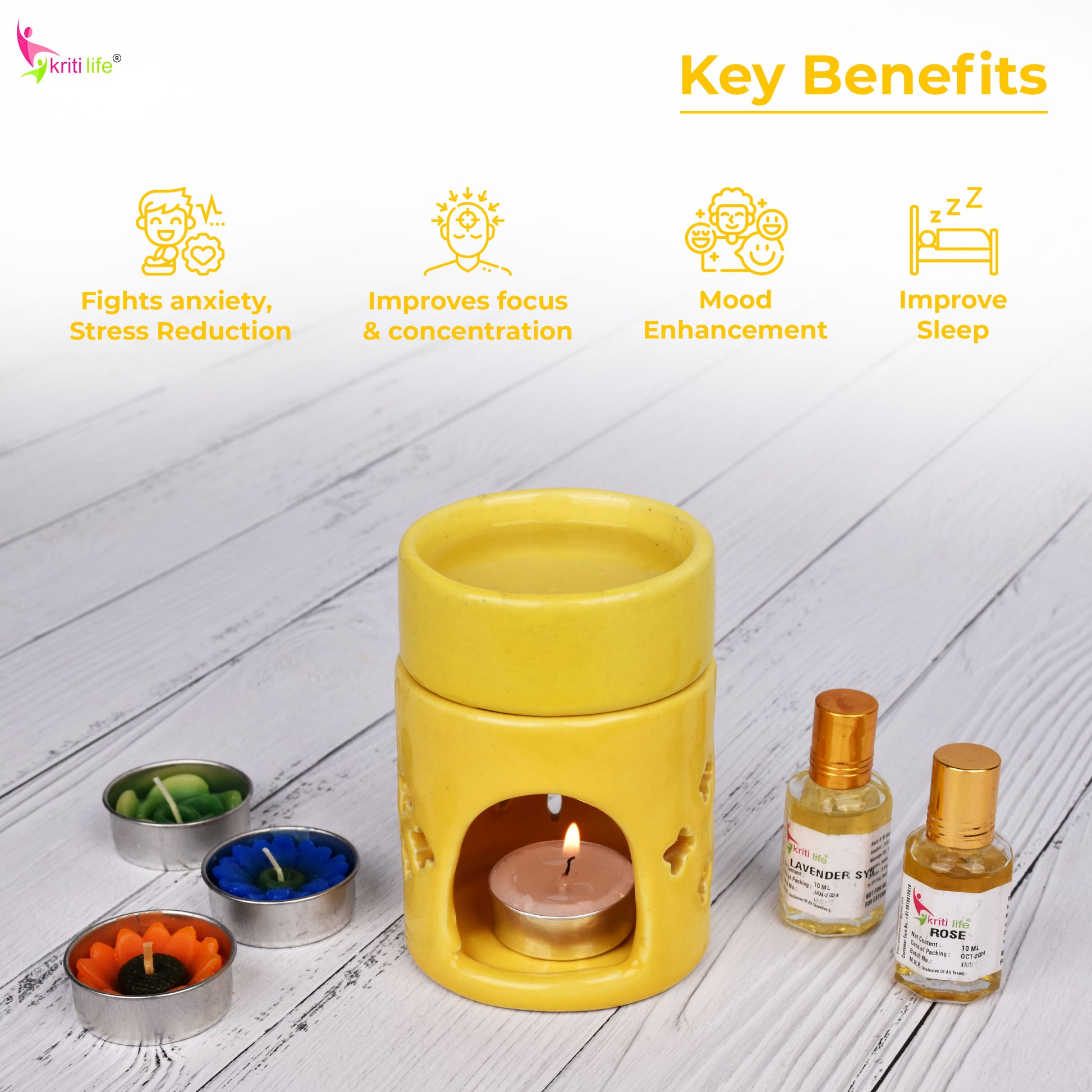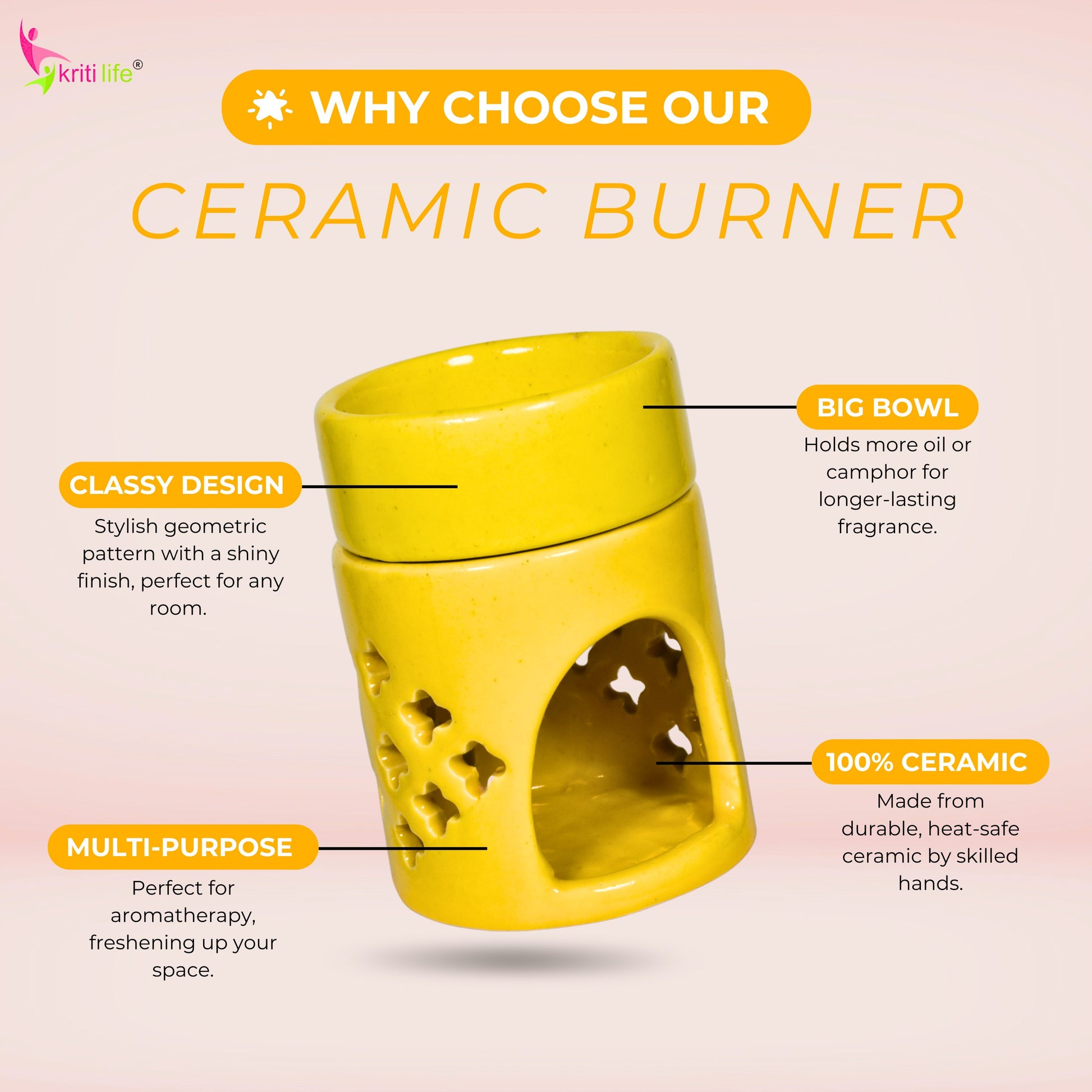 Transform your home or meditation space into a zone of relaxation and rejuvenation with the Kriti Life Round Top Ceramic Aroma Oil Burner. Crafted from heat-resistant ceramic with a premium glossy yellow finish, this burner is more than just a home décor item — it’s your daily dose of peace and calm.