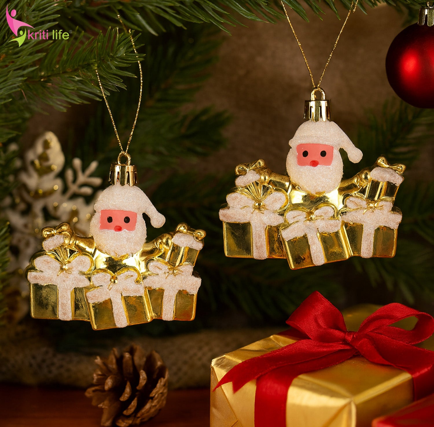 Bring festive sparkle to your Christmas tree with these Kriti Life Santa Gift Box Hanging Ornaments. Designed in an adorable Santa shape holding shimmering golden gift boxes, these lightweight décor pieces add instant charm and elegance to your Christmas setup.